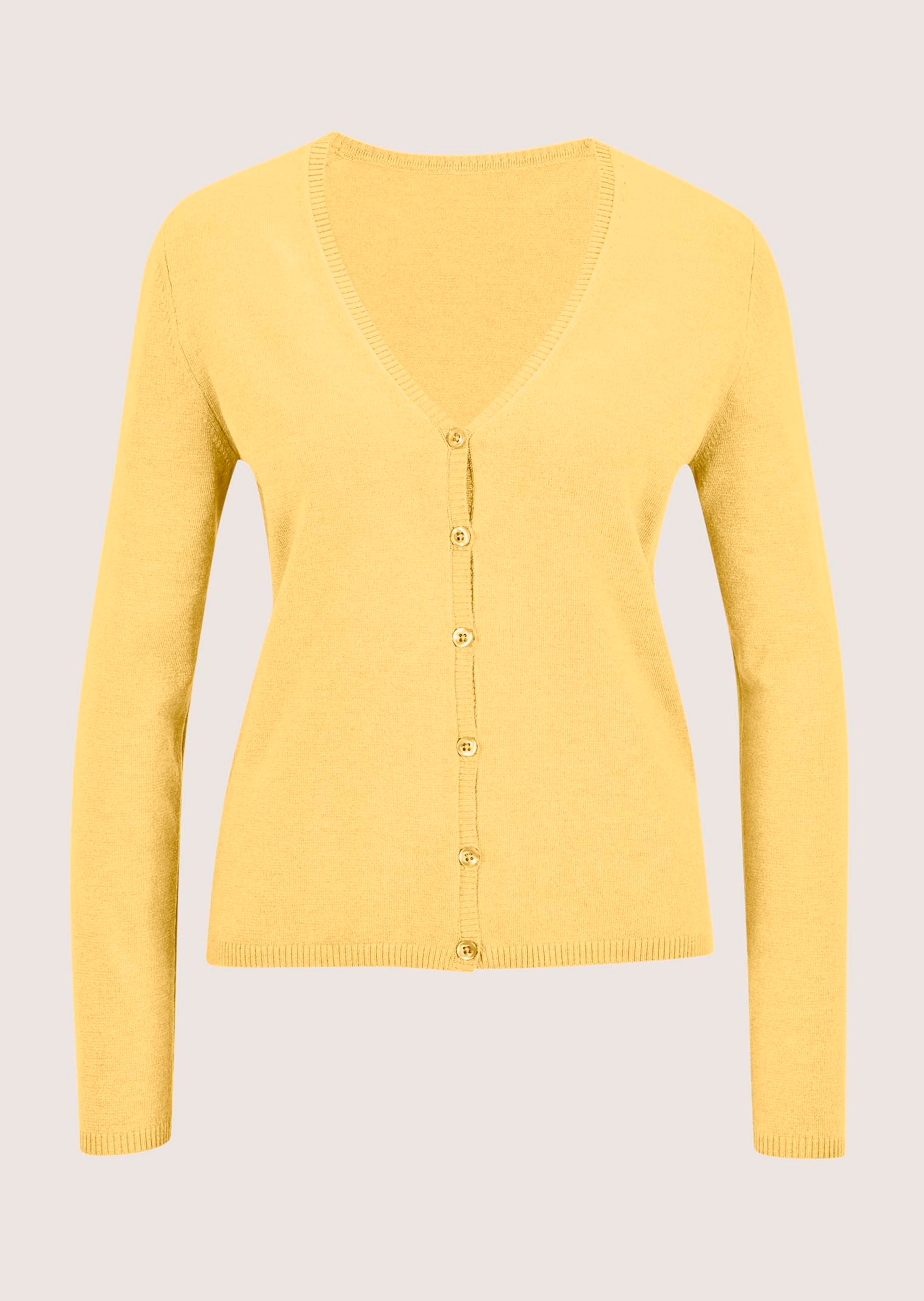 Eine Strickjacke, die einfach immer passt! Der weiche Feinstrick mit Modal fühlt sich angenehm auf der Haut an. Die modische Kurzform mit tiefem V-Ausschnitt, langen Ärmeln und der dezenten Knopfleiste mit tonigen Knöpfen sorgt für eine elegante Optik. Schmale Rippenabschlüsse an Ärmeln, Ausschnitt und Saum vervollständigen das hochwertige Design. Ob lässig zur Jeans oder elegant zum Rock – ein zeitloser Klassiker für jede Gelegenheit.