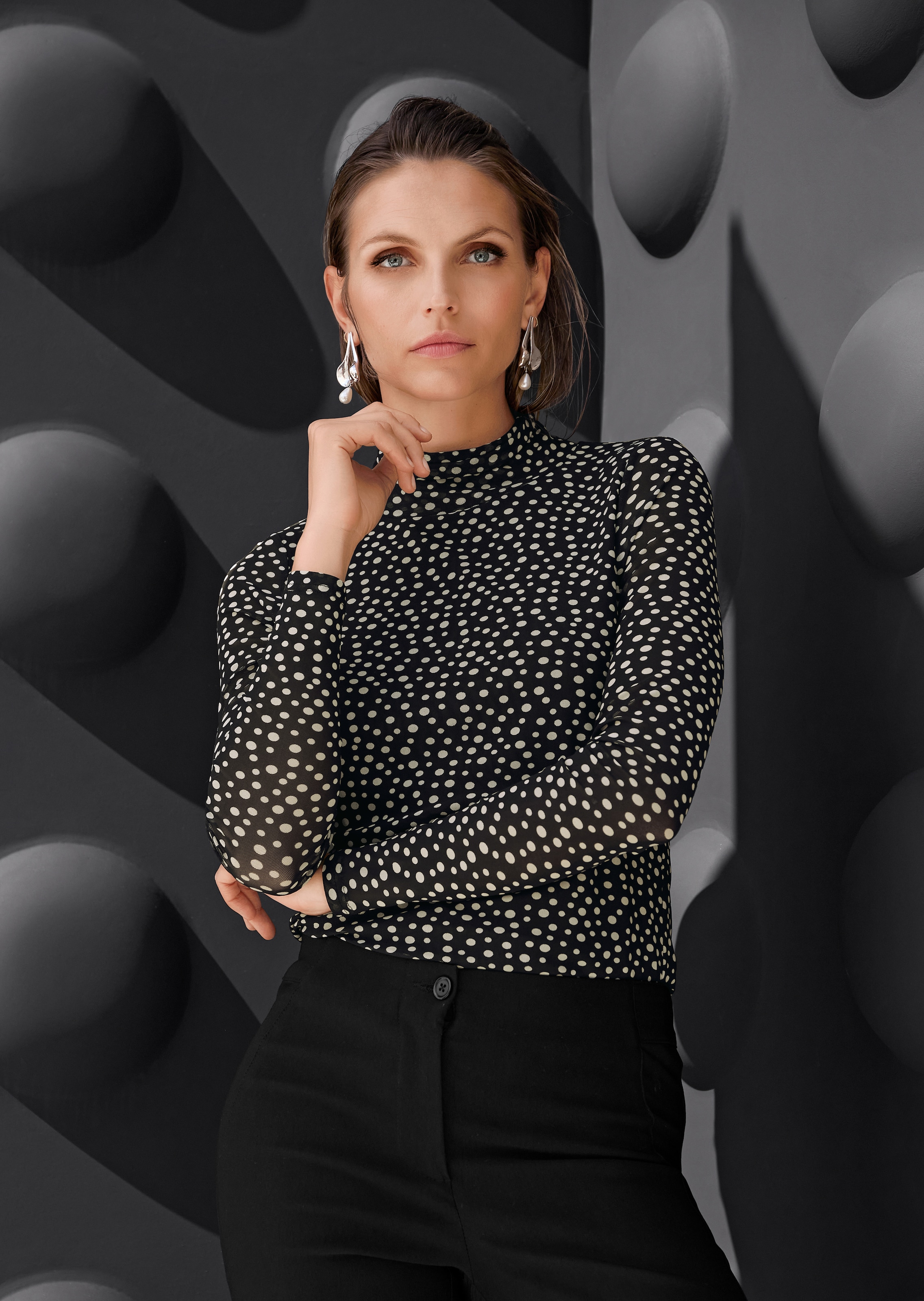 Zart, charmant und doch voller Präsenz. Dieses Shirt kombiniert feminine Eleganz mit komfortabler Bewegungsfreiheit. Der schmale Schnitt schmiegt sich sanft an die Silhouette und bringt die weibliche Form dezent zur Geltung. Dank Stretch-Anteil macht es jede Bewegung mit und bietet wohltuenden Tragekomfort. Rundum platziertes, kontraststarkes Pünktchen-Design verleiht dem Style seinen unverwechselbaren Charakter. Spielerisch und dennoch stilbewusst bringt das Muster modische Frische und einen Hauch verspielter Noblesse ins Spiel. Der feine Stehkragen unterstreicht die klare Linienführung und verleiht dem Shirt modische Aktualität. Lange Ärmel vollenden den Look und machen das Shirt zum vielseitigen Begleiter. Ob solo oder als charmantes Darunter, dieses Shirt hat das Zeug zum Lieblingsstück.