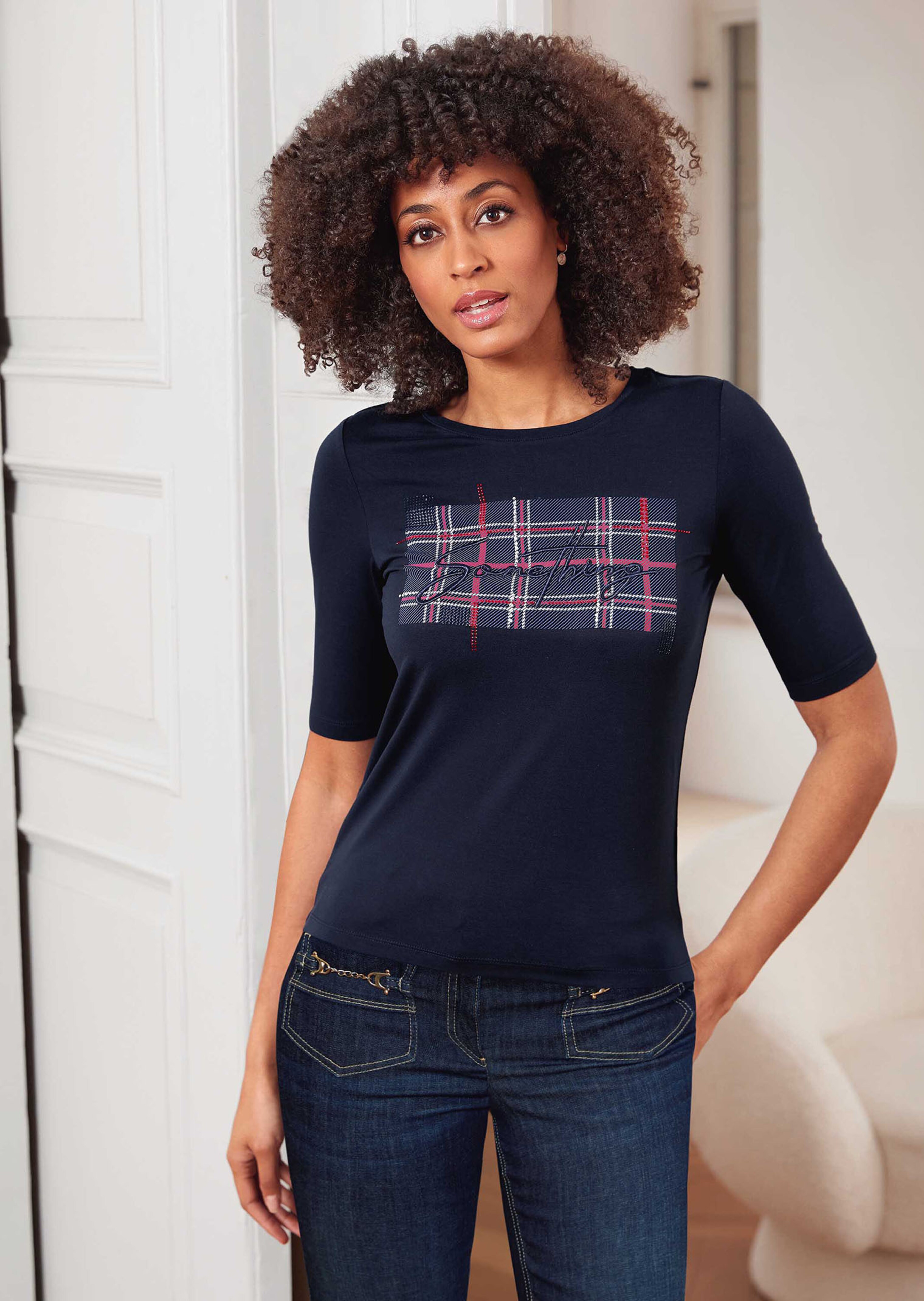 Ein Shirt, das Sie nicht mehr missen möchten! Fliessender Viskose-Stretch sorgt für ein angenehm softes Trage-Gefühl und der individuell variierende Statement-Druck macht aus jedem Stück ein Unikat. Das taillierte T-Shirt ist mit Rundhals-Ausschnitt und halblangen Ärmeln gearbeitet. Der knitterarme Stretch ist ideal für den Reisekoffer und rundet viele Casual-Styles trendy ab.