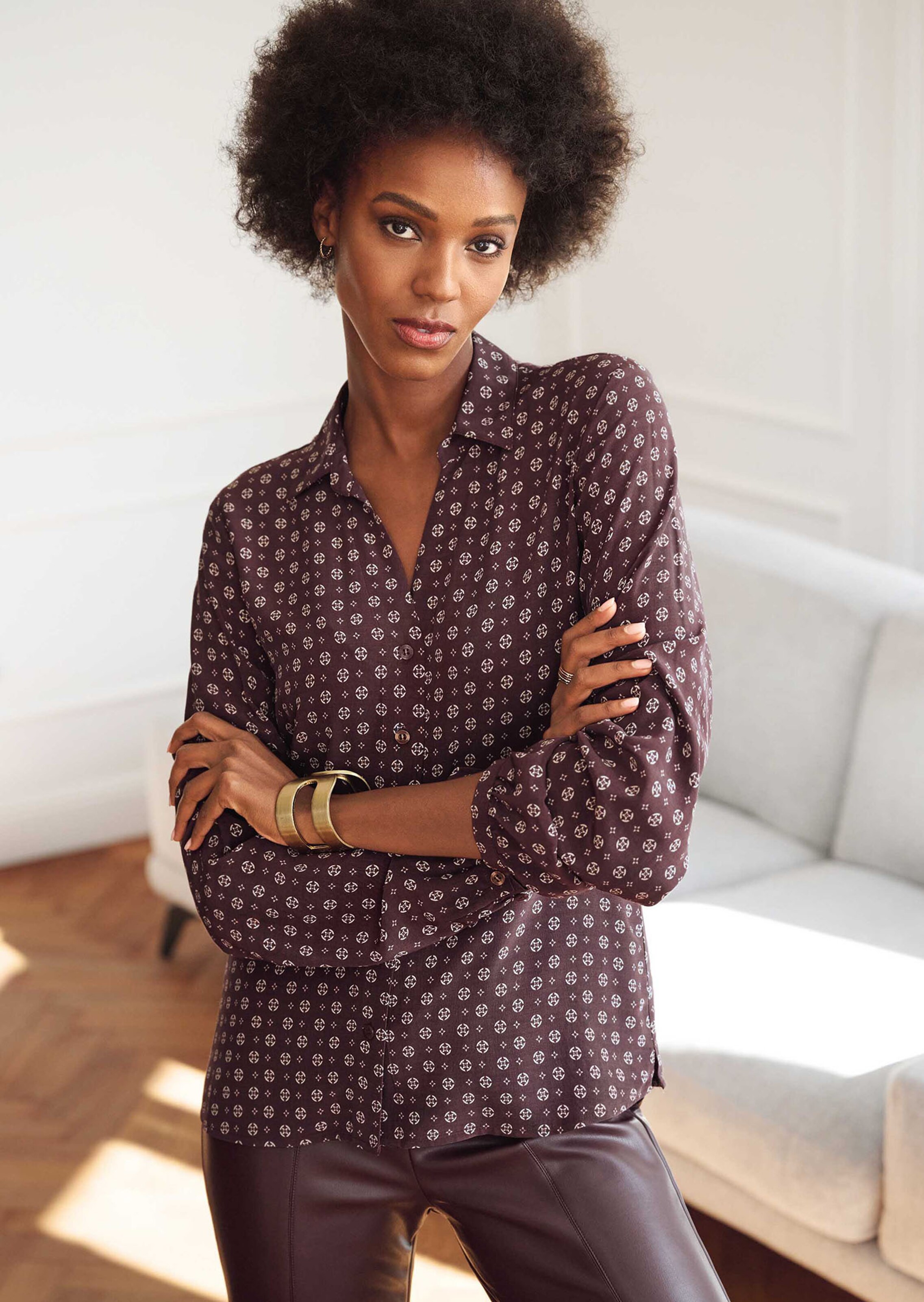 Der coole Bi-Color-Print verleiht der Hemdbluse einen neuen, trendigen Twist und macht jedes Modell zum Unikat. Die taillierte Bluse ist figurbetont aus edler Viskose designt. Sie hat einen Hemdkragen mit Kragensteg, eine Knopfleiste und lange Ärmel mit geknöpften Manschetten.