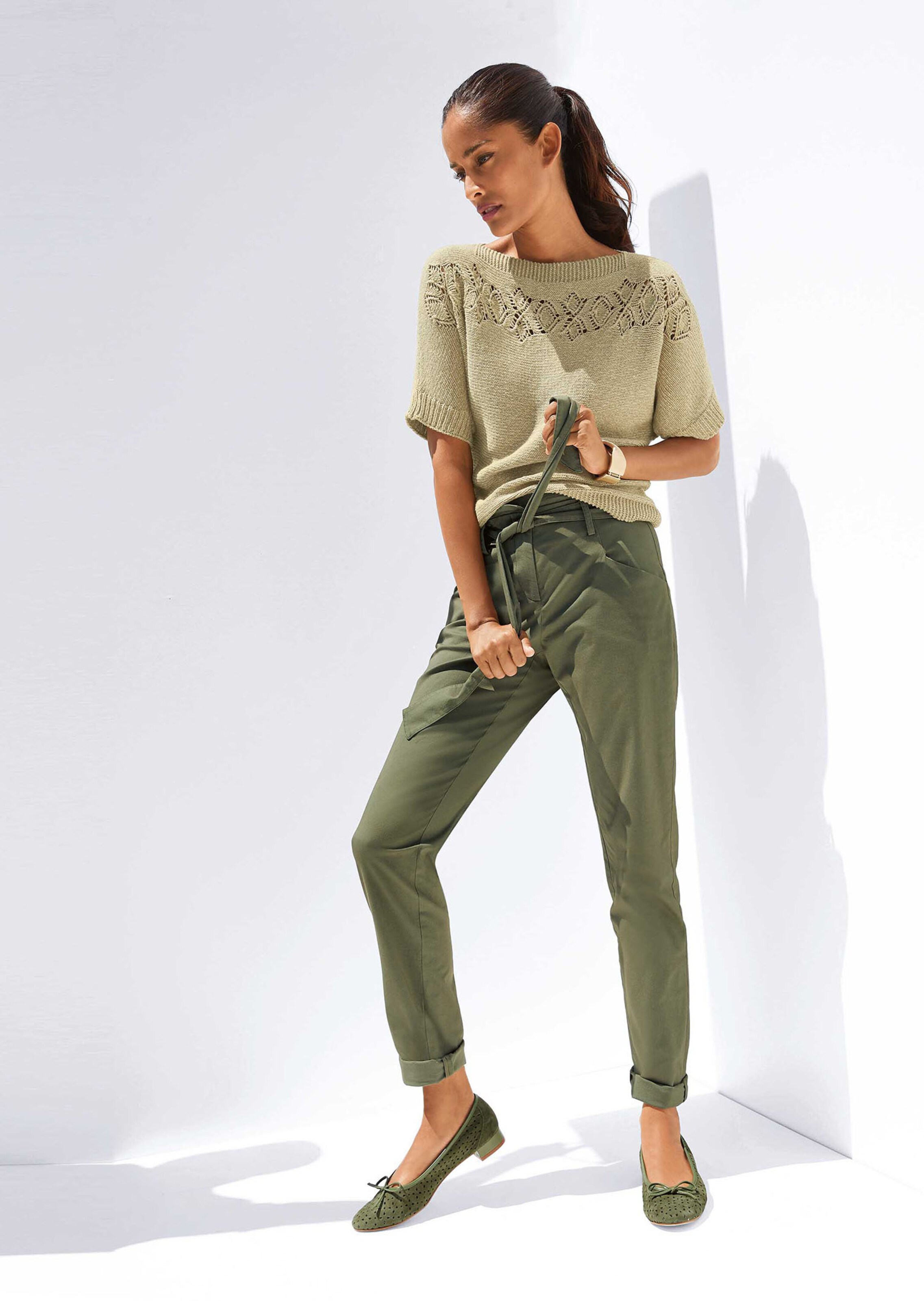 Eine Hose, die sich feminin und lässig präsentiert. Das tonige Bindeband und die Fältchen setzen den Bund neu in Szene. Der hochwertige Cotton-Stretch trägt sich herrlich angenehm und ist die perfekte Qualität für unkomplizierte Sommerhosen. Ausgestattet mit breiten Gürtelschlaufen und schrägen Stecktaschen zeigt die Business- und Cityhose stilvolle Details. Zwei Grössenläufe werden auch den Anforderungen kleinerer Frauen gerecht. In edler Farbgebung lässt sie sich vielseitig kombinieren.