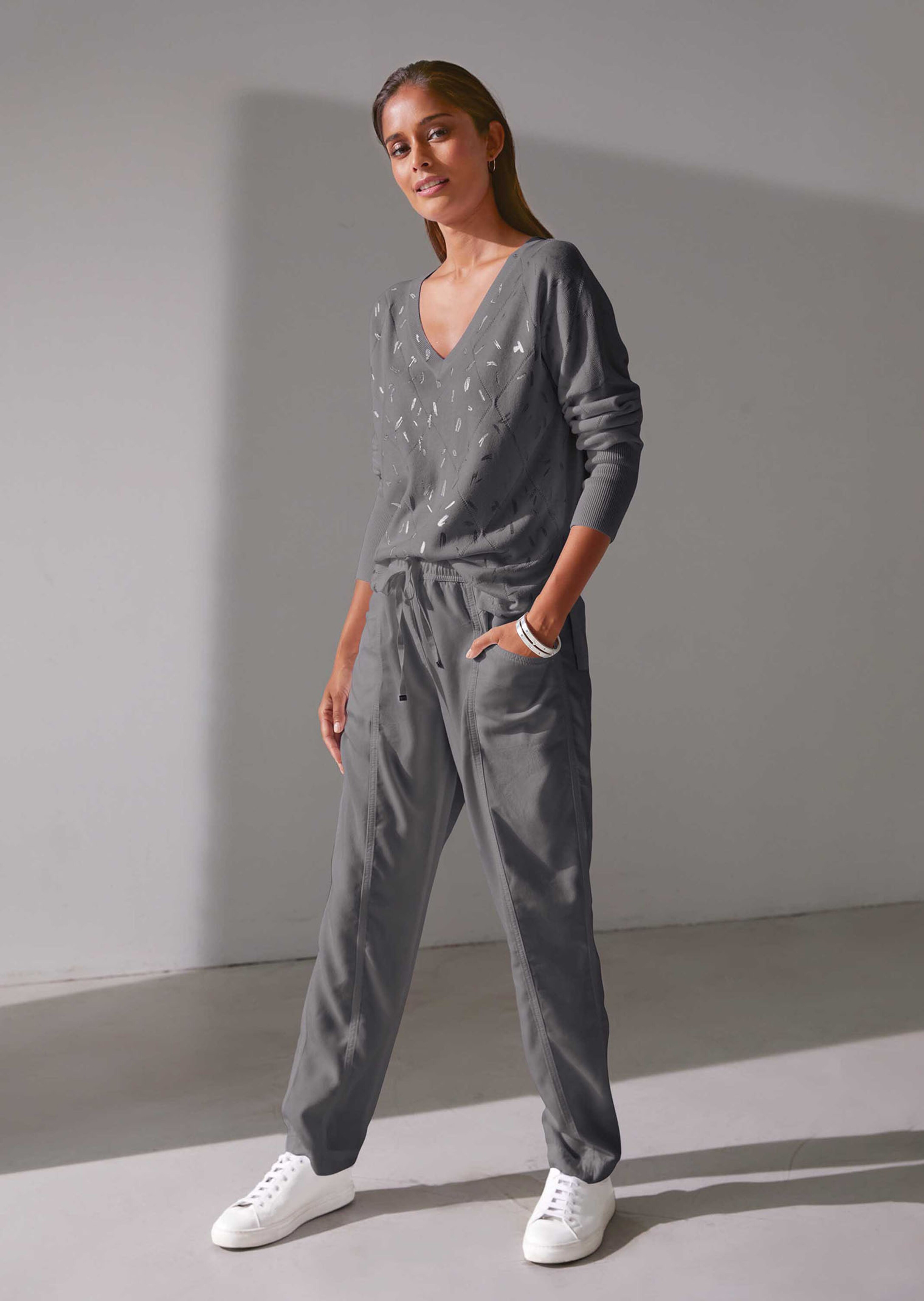 Hosen im Jogg-Pants-Stil sind heiss geliebt und werden überall getragen. Dieses Modell erhält durch die seidig schimmernde Tencelqualität eine edle Note und trägt sich herrlich angenehm. Ein lässiger Style mit vertikaler Teilungsnaht am Vorderbein, schrägen Stecktaschen und Komfortbund mit Zugband. Die Trend-Alternative zur Jeans!