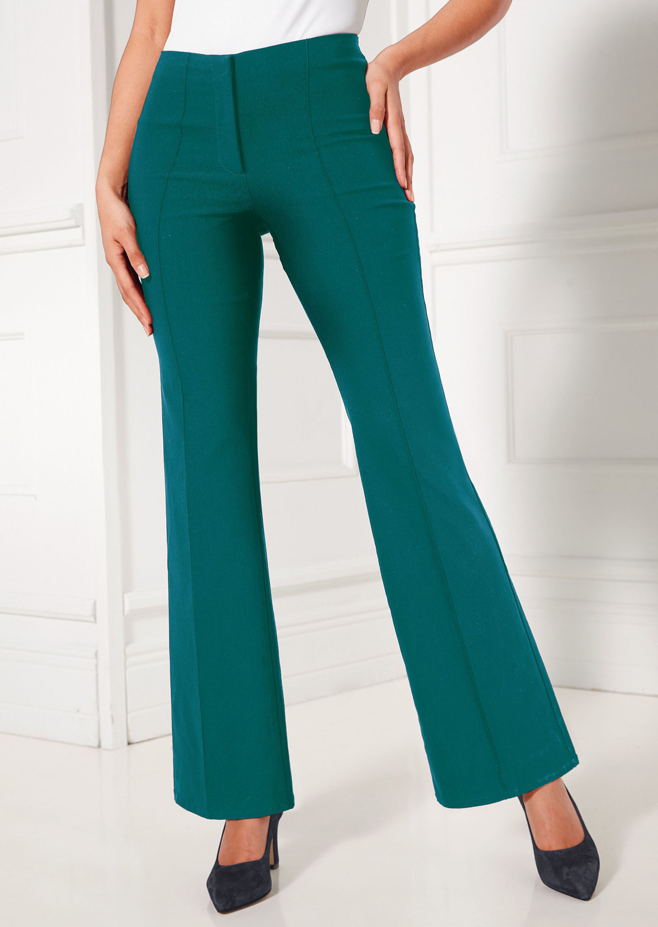Businesslike oder lässig? Unsere smarte Allrounderin im Regular-Fit kann beides! Die stretchbequeme Hose hat einen angeschnittenen Bund mit Innenbundsicherung und Häkchenverschluss. Der gerade, nach unten leicht ausgestellte Schnitt mit abgesteppten Biesen vorne und streckenden Teilungsnähten hinten schmeichelt der Figur.