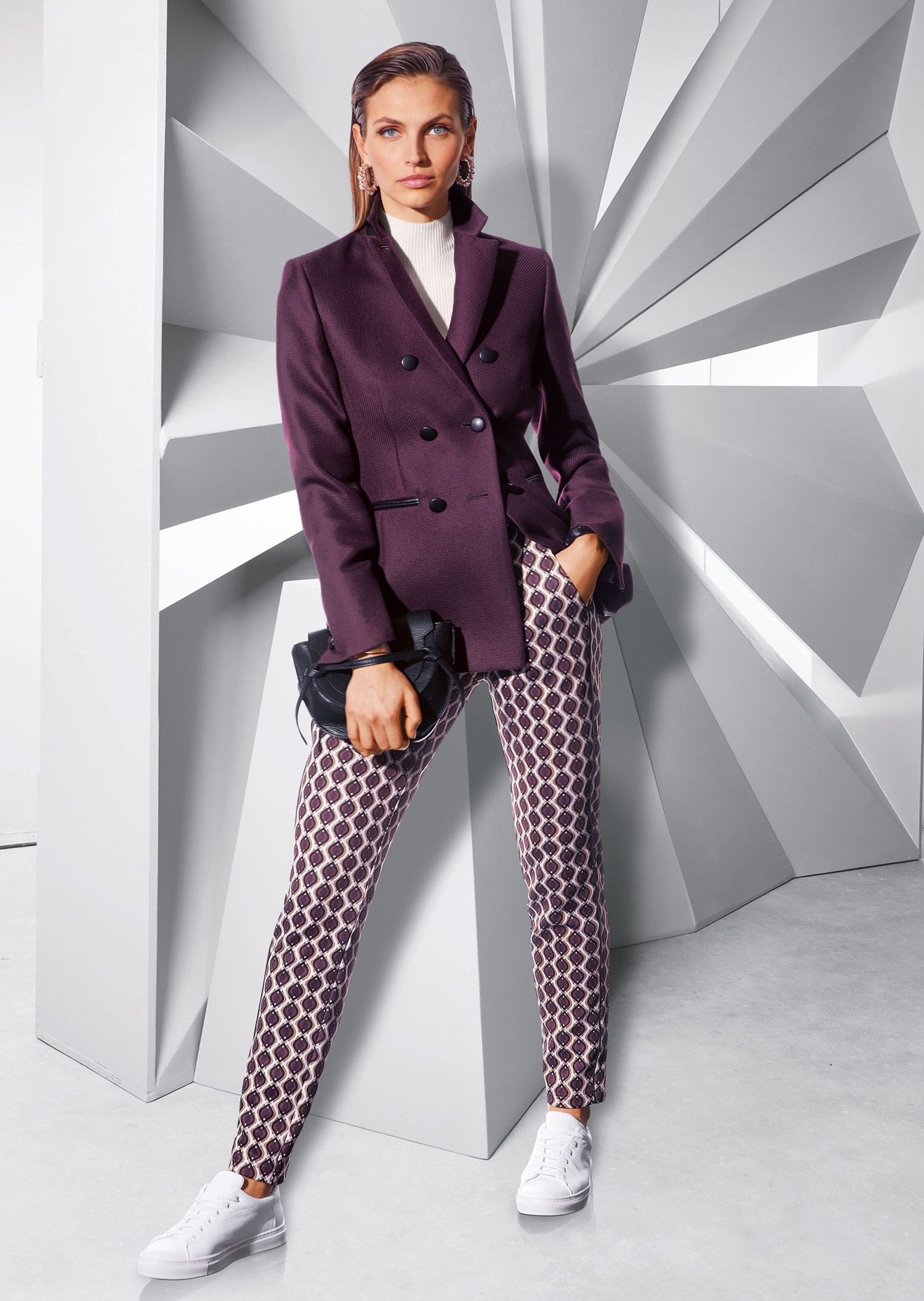 Eine Hosen-Variante, die zahlreiche Anlässe spielerisch ergänzt und mit markanten Akzenten punktet. Ihr trendstarker Print zeigt sich in angesagtem Farbkontrast und wird in dieser Saison gerne zu hellen Basics kombiniert. Betont schlank in der Linie und angenehm auf der Haut macht die Hose dank Stretch-Komfort jede Bewegung mit und sorgt für unbeschwerte Mode-Auftritte. Bequem zum Schlüpfen ist sie mit komfortablem Elastikbund und eingearbeiteten Schubtaschen ausgestattet. Paspeln aus Leder-Imitat setzen die Seitennähte in Szene und verleihen ihr modischen Chic. Die Verarbeitung in Kurzgrössen wird auch den Ansprüchen etwas kleinerer Frauen gerecht.