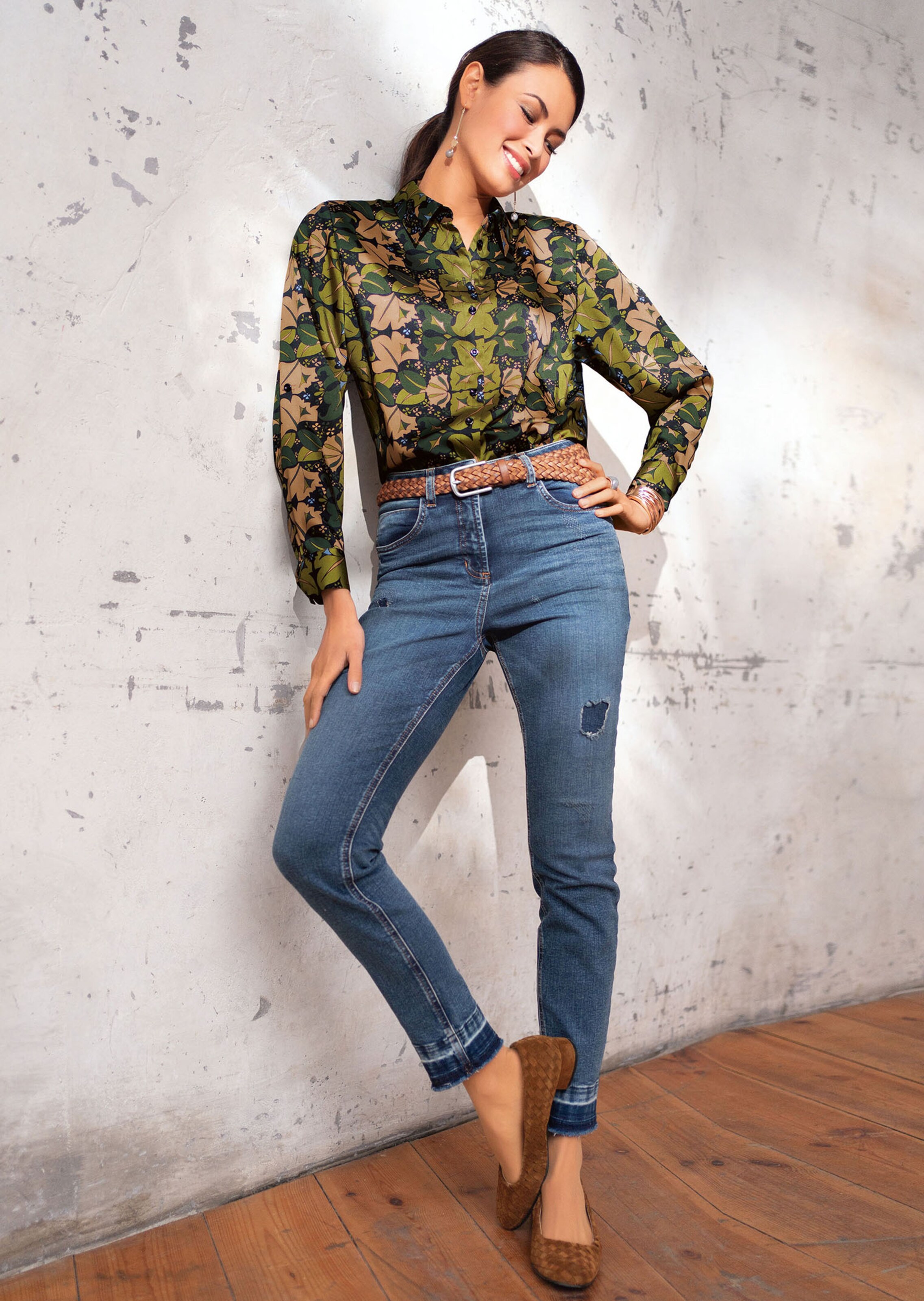 Ihr lässiger Look und ihre nachhaltige Herstellung machen sie zu einem unbedingten Must Have! Die Jeans mit nachhaltiger Baumwolle und Waschung wirkt so trendy durch die unterlegten Destroyed-Effekte. Der leicht fransige Saum unterstreicht den Lässiglook. Ihr femininer, knöchellanger 5-Pocket-Style mit schmalem Bein und knackigem Sitz zeichnet eine fantastisch schlanke Linie. Ein M-Jeansknopf, Logo-Nieten und ein Fake Leder Jeanslabel sind edle Label-Attribute. Durch zusätzliche Kurzgrössen können sie auch kleine Frauen prima tragen.