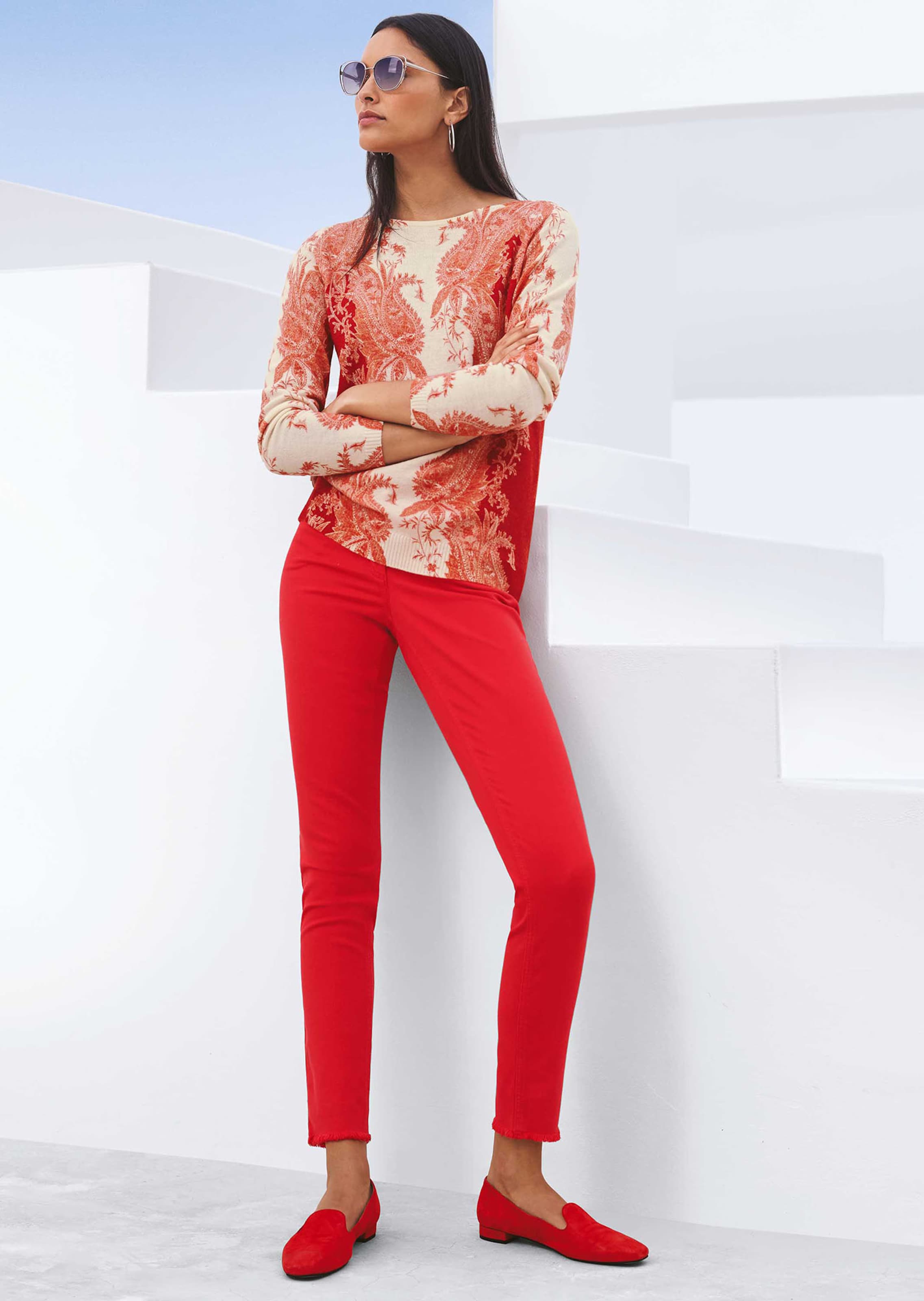 Eine Jeans im Skinny-Fit, die mit angesagten Fransen dem Lässigtrend der Saison folgt. Fransen sind jetzt auch bei Hosen ein grosses Thema und setzen hier einen frechen Akzent. Im aktuellen Five-Pocket-Style und mit schmaler Silhouette zeichnet die enge Jeans eine lange Beinlinie und überzeugt mit gutem Sitz. Formstabil und trageangenehm ist sie eine Allrounderin der unterschiedlichsten Kombinationen und Anlässe. Hochwertig verarbeitet mit MADELEINE-Jeansnieten, Logo-Plakette, Formbund, Gürtelschlaufen und Rückenpasse zeigt sie klassische Details.