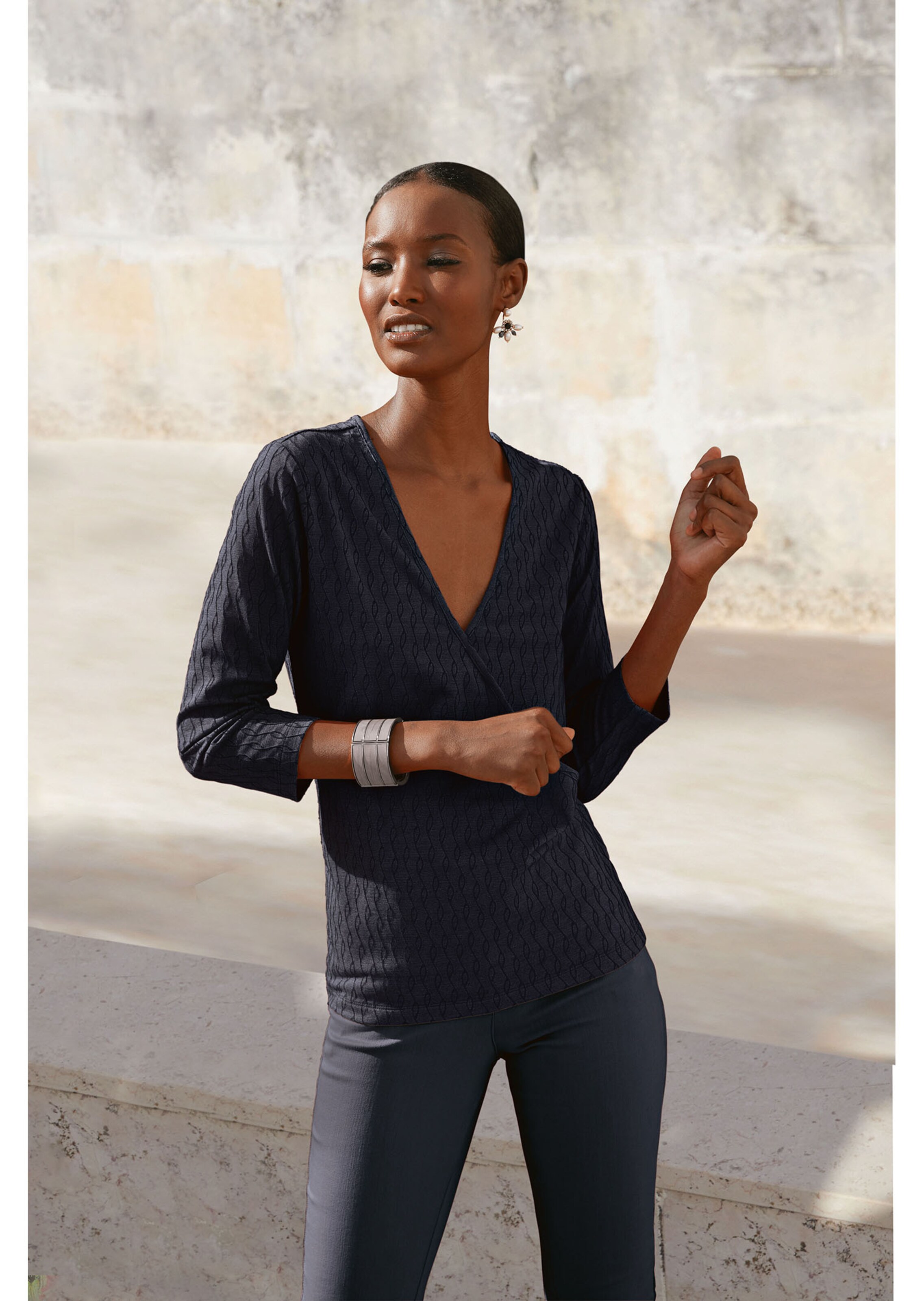 Ein ultimatives Fashion-Basic, das mit dekorativer Struktur in 3D-Optik und einer femininen Linienführung puren Chic verspricht. Der hochwertige Jersey aus Viskose und Elasthan schmiegt sich sanft der Silhouette an, zugleich trägt er sich herrlich angenehm und verwöhnt mit reisefreundlichem Komfort. In taillierter Form und mit Ärmeln in 3/4-Länge lässt sich das Shirt wunderbar vielseitig kombinieren und trägt auch unter Blazer & Co. nicht auf. Für den letzten Style-Schliff sorgt der versteckte Druckknopf, der das feminine V-Dekolleté perfekt fixiert.