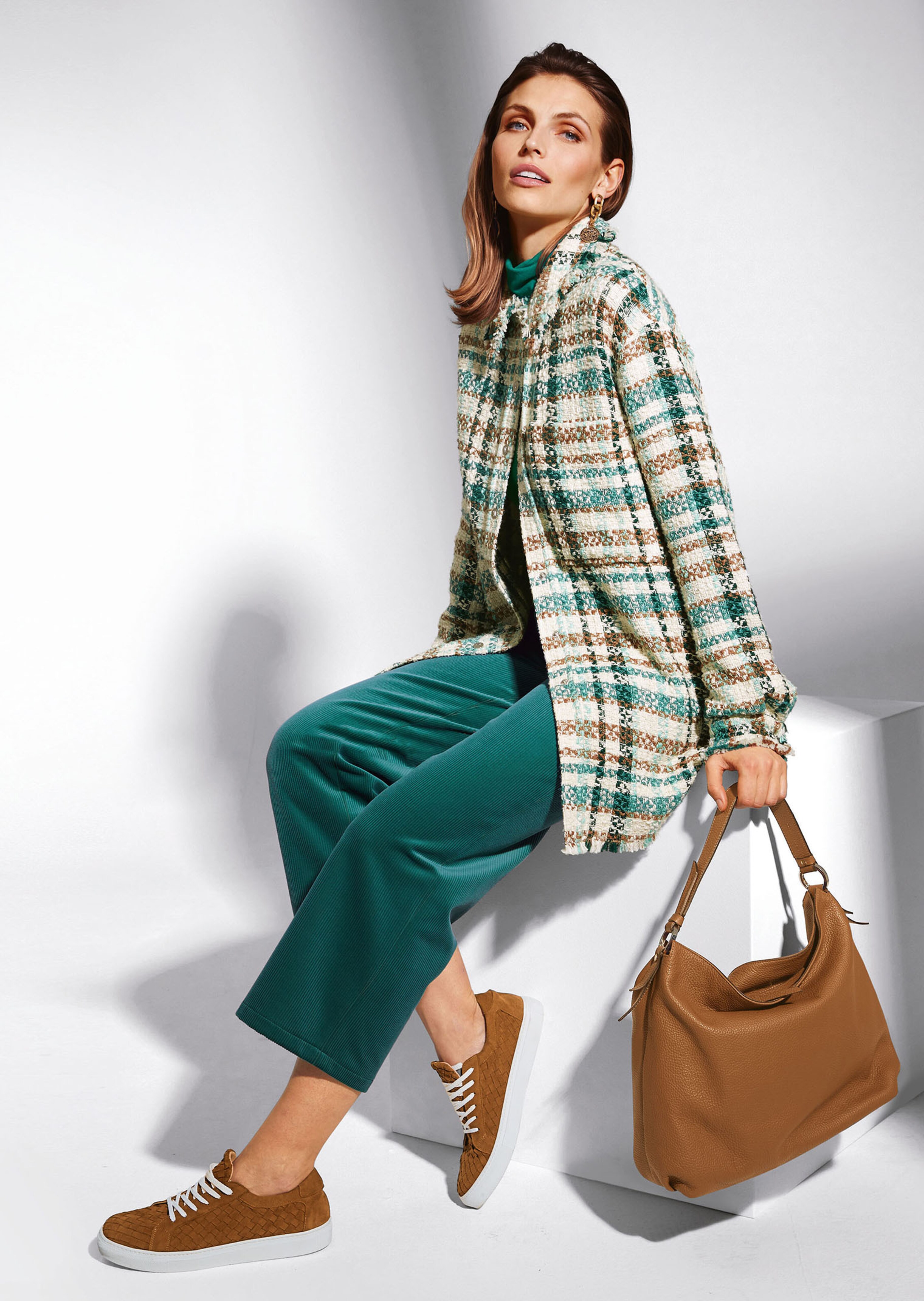 Eine Jacken-Variante, die mit betont lässiger Modernität begeistert. Ihr grossflächiges Karo bringt Schwung in die Garderobe und mischt jede Kombination ordentlich auf. Die legere Oversize-Form und modische Fransenkanten an Kragen, Ärmeln und Saum liegen voll im Trend und punkten vor allem offen getragen mit cooler Ausstrahlung. Fashion-Tipp: kombiniert wird in dieser Saison bevorzugt mit hellen Naturtönen. Natürliches Baumwollgarn ist ausgesprochen sympathisch auf der Haut und durch die futterlose Verarbeitung angenehm leicht im Trage-Gefühl. Die grosszügige Jacke ist mit schlichtem Hemdkragen, aufgesetzter Brusttasche, silberfarbenen Logo-Druckern und seitlich eingearbeiteten Nahttaschen ausgestattet. Ärmel mit Druckmanschetten und kurze Seitenschlitze runden den Style gekonnt ab.