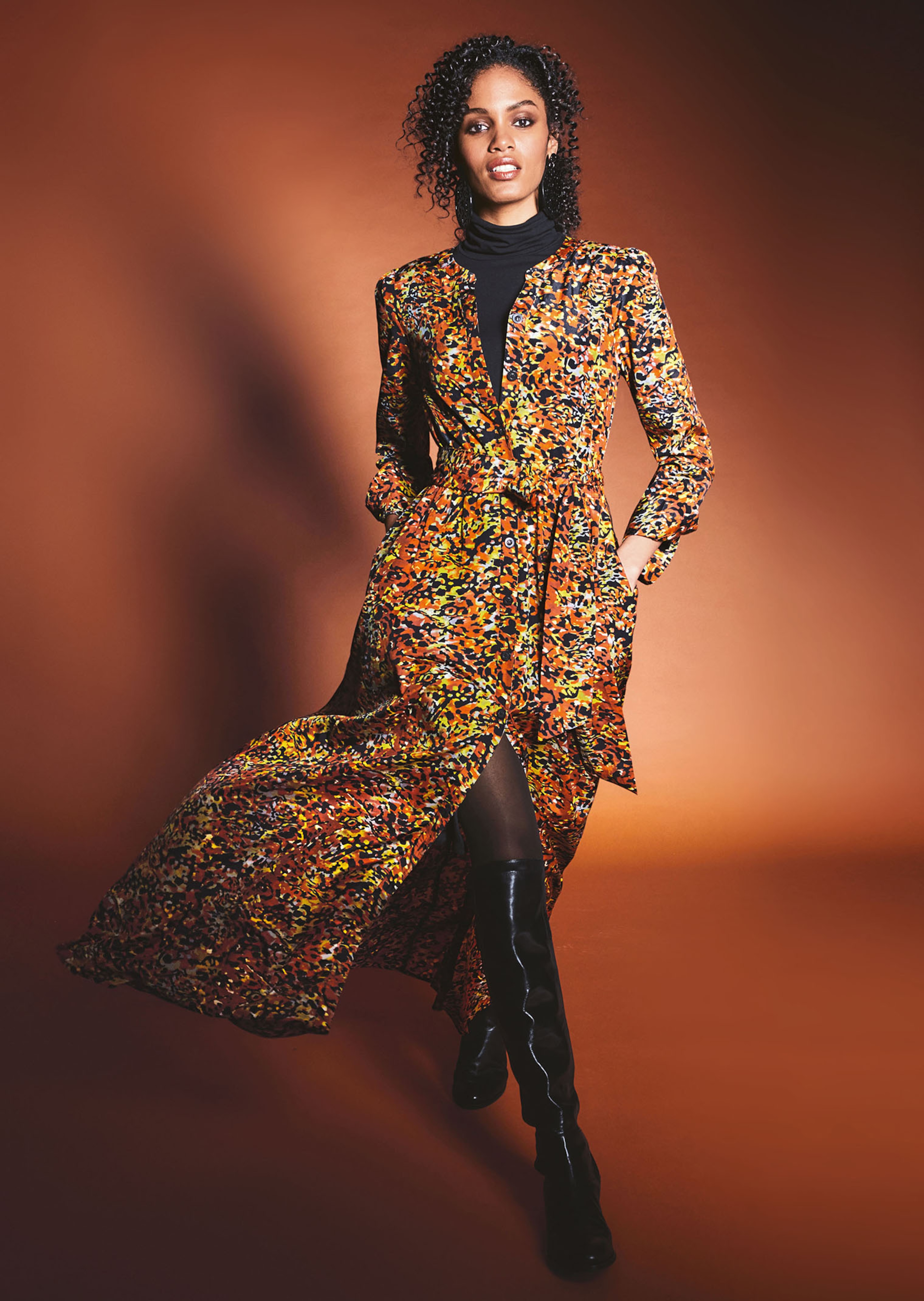 Sein Dessin macht es zum Must Have! Das Kleid mit Bindegürtel begeistert mit seiner lässig-luxuriösen Aussage. Der faszinierende Print macht aus jedem Stück ein Unikat. Sein wertvoller Seidenmix trägt sich herrlich angenehm. Wir haben es für einen modernen Look mit durchgehender Knopfleiste, Langarm, Manschette, Schulterpolstern, Stehkragen und schwingendem Rock gestaltet. Durch das abnehmbare Bindeband können Sie es individuell auf Taille bringen. Ob am Tag oder am Abend: Das weich fliessende Kleid lässt Sie im Handumdrehen top gestylt sein.