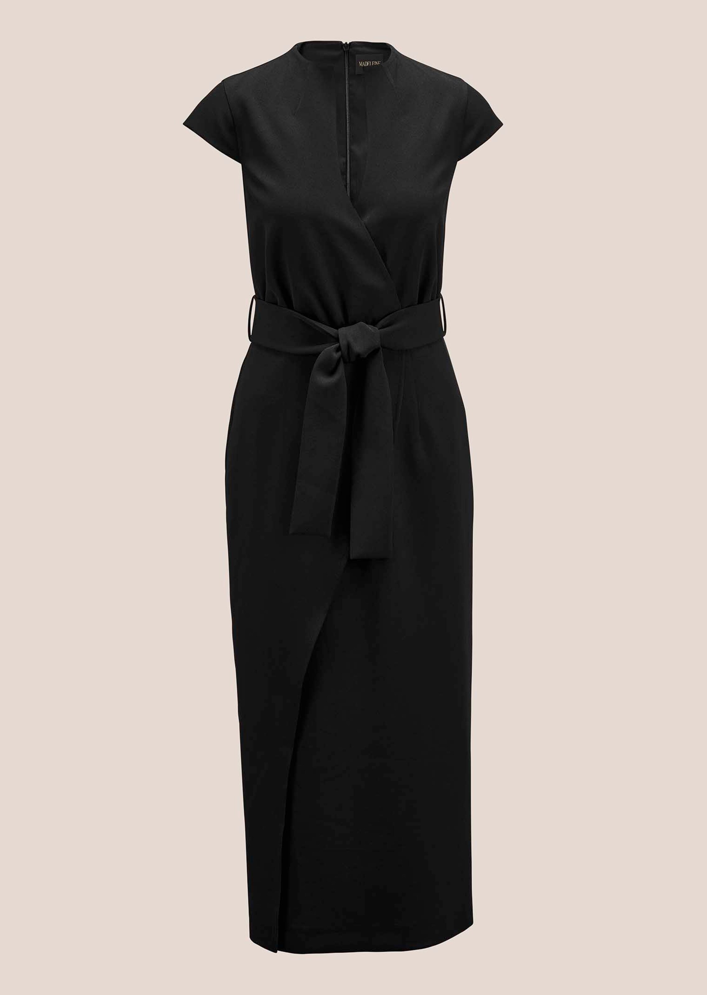 Midikleid in Wickeloptik mit raffinierter Ausschnittlösung. Kurze Ärmel. Taillenbindeband. Reissverschluss und Gehschlitz auf der Rückseite. Voll gefüttert.