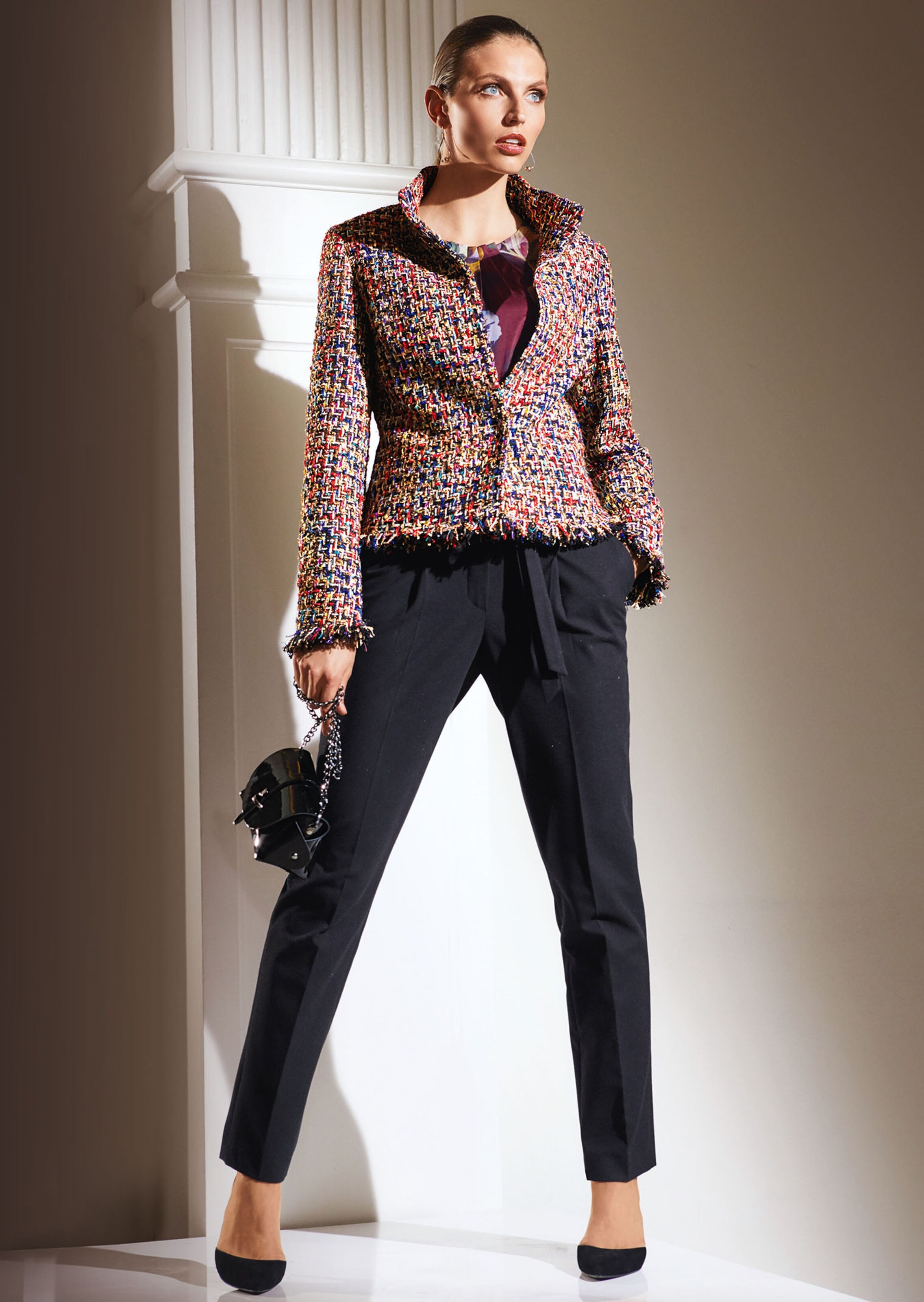 Eine Bundfaltenhose, die in angesagter Knöchellänge ihr Stilstatement setzt. In modisch verkürztem Style transportiert sie die lässige Eleganz der neuen Businesshosen. Die beliebte Ceramica-Qualität überzeugt mit ihrer edlen Oberfläche, ihren angenehmen Trageeigenschaften und ihrem pflegeleichten Charakter. So ist sie auch auf Geschäftsreisen eine zuverlässige Begleiterin der unterschiedlichsten Termine. Mit Bundfalte, Bügelfalte, Schubtaschen und angedeuteten Gesäss-Paspeltaschen zeigt sie Stil und Klasse. Eine exakte Passform sichert der Formbund mit abnehmbarem Bindeband, Gürtelschlaufen und Komfortbund im Rückteil. Ergänzen Sie die knöchellange Bundfaltenhose zu geschmeidigen, luxuriösen Oberteilen und offiziellen Partnern für einen eleganten Auftritt in Meeting & Co.