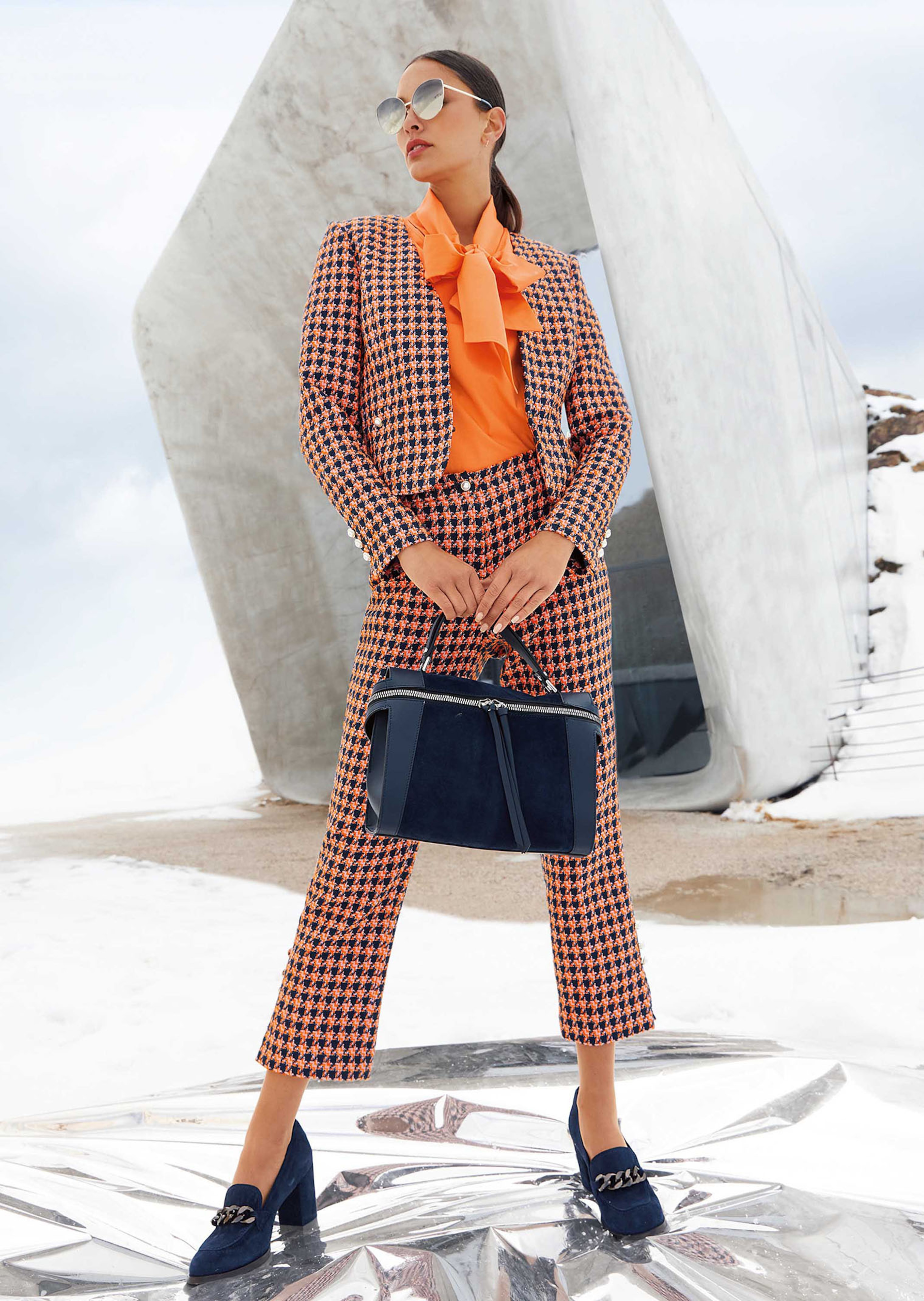 Eine Kurzblazer-Variante, die durch ihre schlanke Passform besonders sexy wirkt und ein echtes Fashion-Statement setzt. Der edle Tweed-Bouclé folgt mit Hahnentritt-Muster und dekorativen Schmuckknöpfen ganz dem Trend der Zeit. Der kragenlose Style ist auf kleine Haken zu schliessen und an Ärmelschlitzen und aufgesetzten Taschen mit Zierknöpfen in Perlenform gearbeitet.