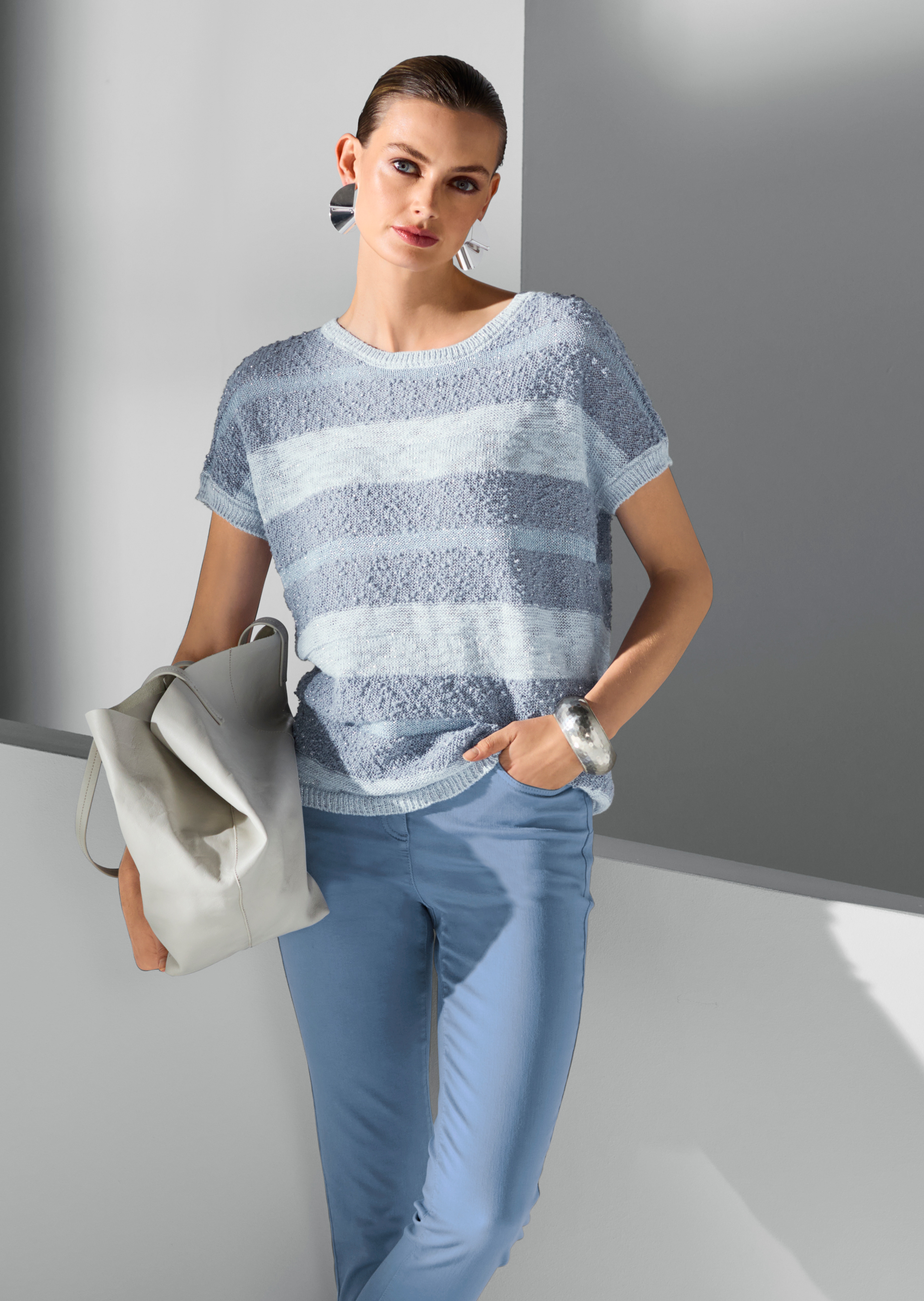 Ein Sommer-Pullover von edler Modernität. Seine lässige Form und die farbharmonischen Streifen eignen sich perfekt für angesagte Styling-Varianten. Die wertvolle, italienische Garnmischung ist angenehm im Trage-Gefühl und bringt mit glanzvollem Effektgarn eine Prise Glamour in den Look. Ein klassischer Rundhals-Ausschnitt und überschnittene Schulterpartien runden den Style gekonnt ab.