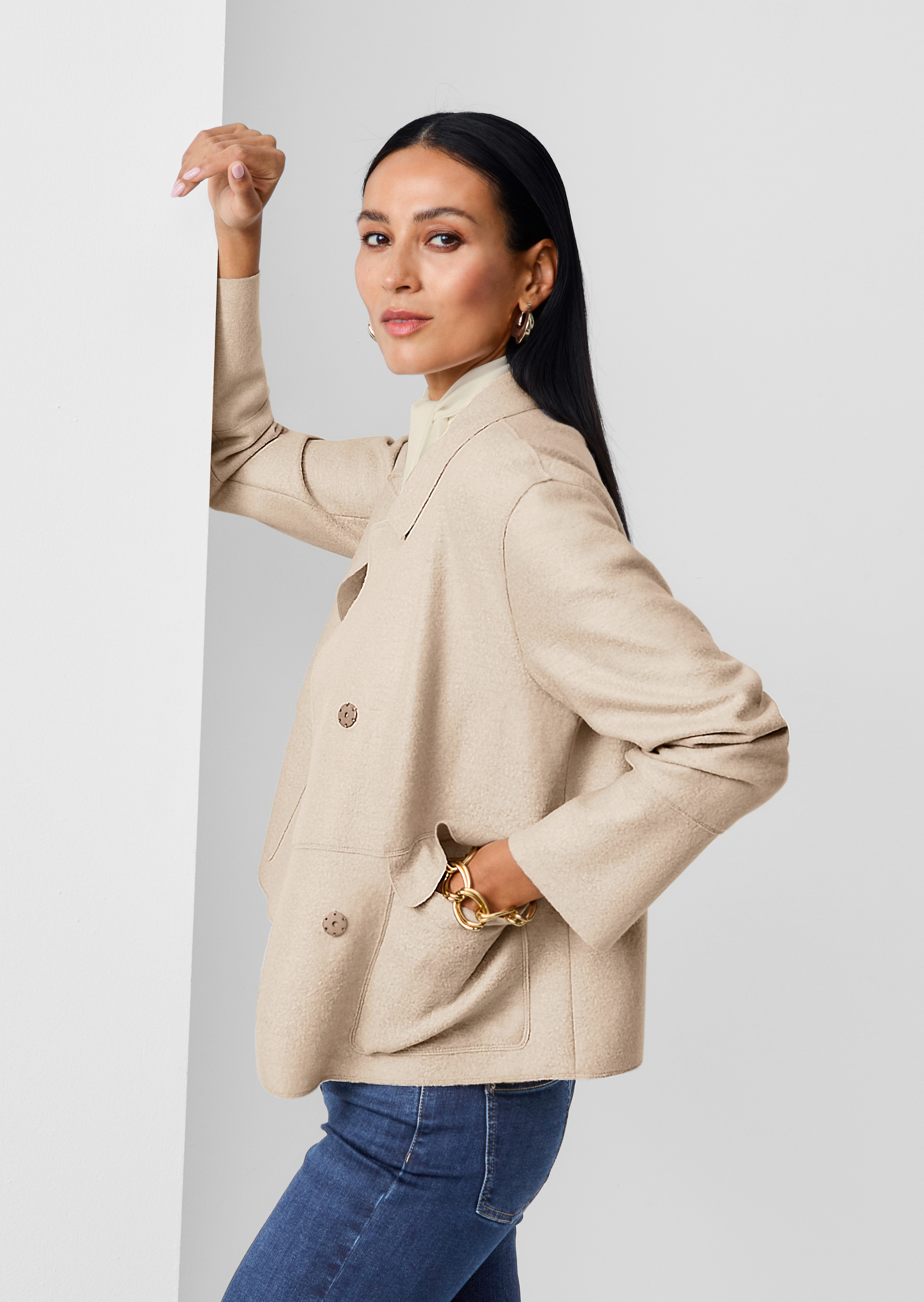 Eine Blazer-Variante, die mit edel sportivem Chic glänzt und trendbewusste Auftritte garantiert. Die hochwertige Schurwoll-Qualität ist wertvoll im Griff und zeigt sich in detailgenauer Verarbeitung. Modisch kurz und mit grossen, aufgesetzten Pattentaschen sorgen Teilungsnähte an den langen Ärmeln für eine raffinierte Manschetten-Optik. Die offenen Schnittkanten, verdeckt gearbeitete Druckknöpfe und ein kleiner Klappkragen unterstreichen die trendorientierte Linie und machen den Kurzblazer zum echten It-Piece!