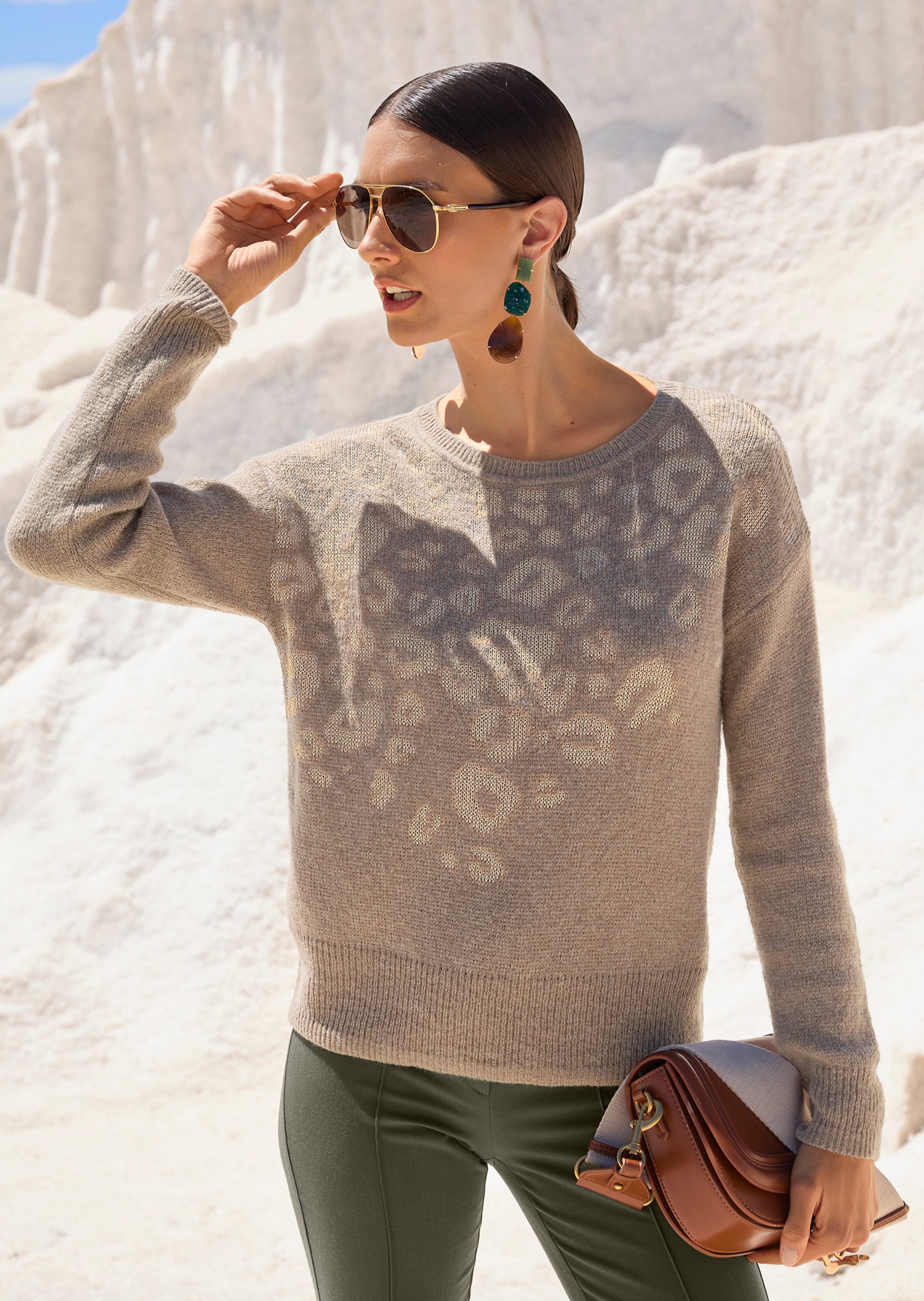 Entdecken Sie einen Pullover in aktueller Kurzform, der mit vorderseitigen Leo-Intarsien aufregende Akzente setzt und durch eingearbeitetes Effektgarn zarten Glanz und eine glamouröse Note hinzufügt. Mit grosszügigem Rundhals-Ausschnitt, langen Ärmeln und leicht überschnittenen Schulterpartien bietet dieser Pullover stilvolle Vielseitigkeit. Die Mischung aus hochwertigen italienischen Garnen sorgt für ein kuschelig weiches Trage-Gefühl und lässt sich hervorragend kombinieren. Holen Sie sich dieses Strick-Highlight!