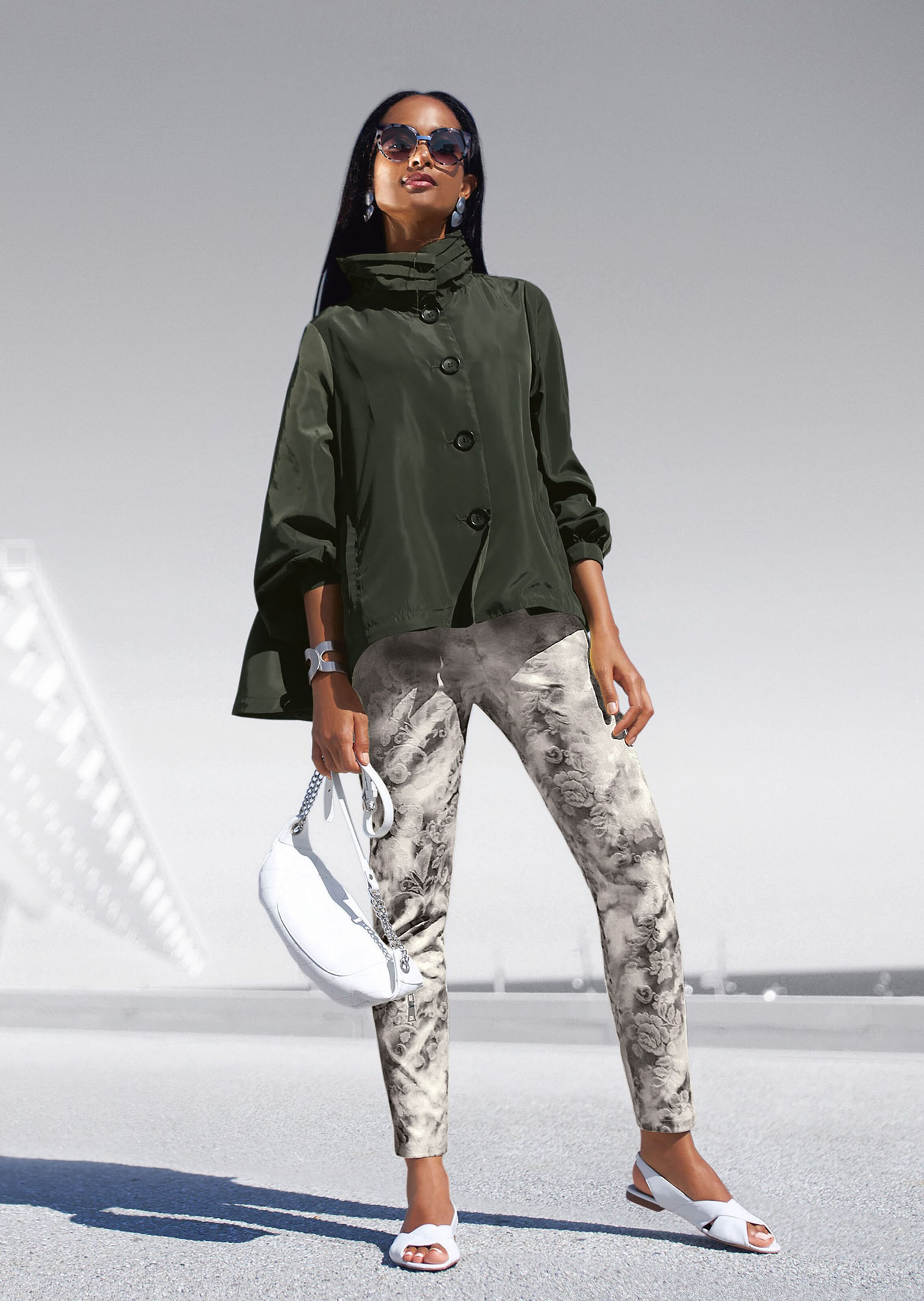 Edel-lässige Übergangsjacken haben Saison! Die leichte Jacke in A-Linie umspielt in dezenter Oversizedform die Figur. Wir haben sie für einen modernen Look mit verlängertem Rücken, gerafftem, umschlagbaren Stehkragen, langen Ärmeln und rückseitiger Kellerfalte gestaltet. Der Saum-Gummizug betont die Form. Sie ist ausgestattet mit Knopfleiste, Zippertaschen, schmalen Knopf-Manschetten, eingefassten Innennähten und leicht gerundetem Saum. Ihre moderne, leichte Ware ist pflegeleicht. Brustabnäher ab Gr. 42 geben ihr Kontur.
