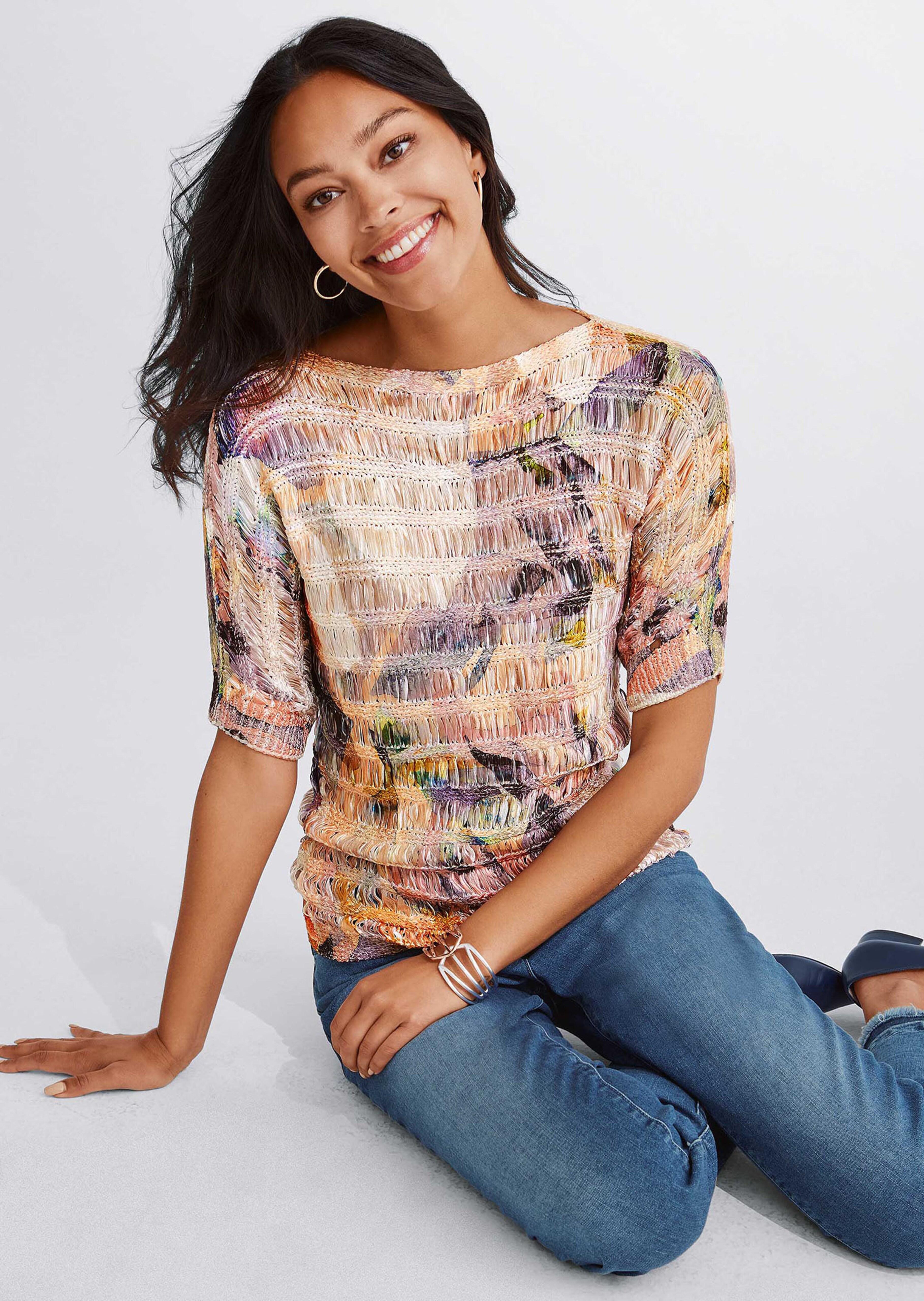 Ein fantastischer Effekt: Der luftige Sommerpullover aus italienischem, bedruckten Bändchenstrick trägt sich angenehm kühl an warmen Tagen. Der leicht transparente Formstrick zeigt eine dezente Ringeloptik. Dank der zarten Farben können Sie den Bändchenpullover gut zu hellen Tönen kombinieren oder zu strahlendem Weiss. Sein Schnitt ist schlank und feminin mit U-Boot-Ausschnitt und Kurzarm.
