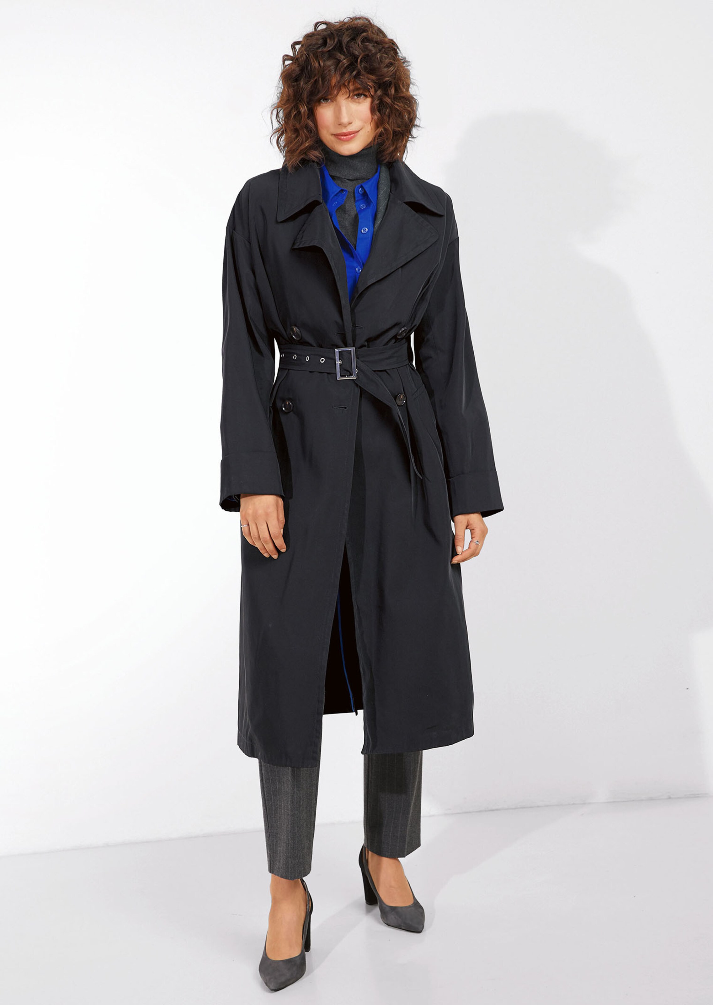 Auch Klassiker mögen es jetzt etwas grösser und zeigen sich im beliebten »Oversize-Shape«. Die legere Trench-Variante besticht durch ein komfortables Trage-Gefühl und sorgt nebenbei für ein gutes Gewissen! Obermaterial und Futter des Mantels sind zu 100% aus nachhaltig recycelten Polyester-Fasern hergestellt und tragen so zum Schutz unserer Umwelt bei. Der stiltypische Reverskragen zeigt sich hier in markanter, weit ausladender Form und bedeckt die überschnittene Schulterpartie nahezu komplett. Auch die lässig weiten Umschlagärmel bringen Abwechslung ins Spiel. Ein charakteristischer Taillengürtel, aufgesetzte Leistentaschen und ein rückseitiger Gehschlitz sind State of the Art. Sie machen den Look komplett und sorgen für einen stilvollen Auftritt. Die zweireihige Knopfleiste ist innenseitig mit verdeckten Gegenknöpfen ausgestattet. Sie halten den Style in Form und verhindern einen unschönen Faltenwurf. Besonders edel: das farblich passende Innenfutter ist mit kontraststark paspelierten Nähten gearbeitet. Praktische Transportschlaufen und ein stabiler Kettenaufhänger machen den Look komplett.