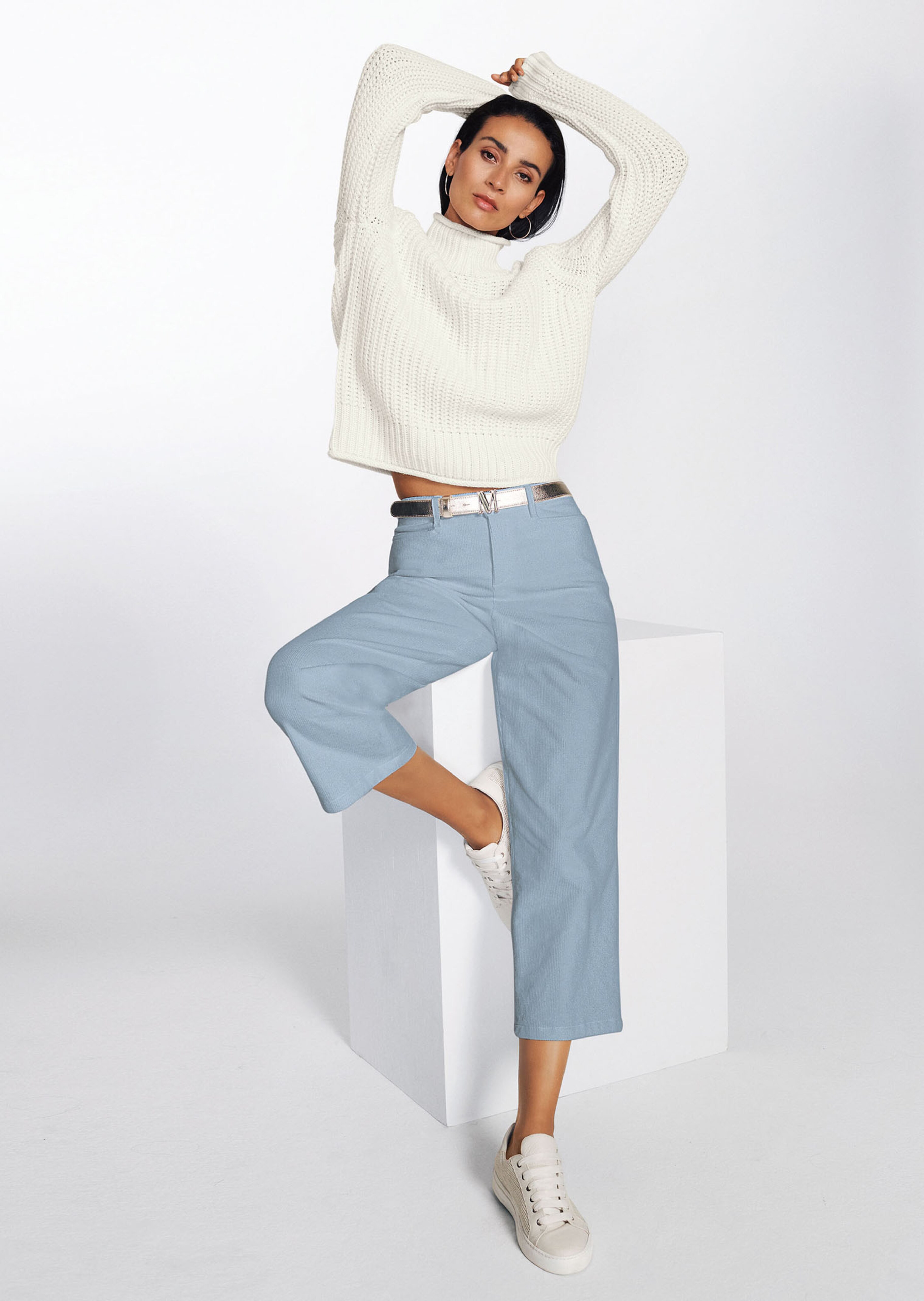 Man zieht ihn an und sieht sofort stylisch aus. Dieser lässige Oversized-Pullover aus edler Schurwolle ist ein Must-have! Der Pulli in Perlfang-Strick ist in legerer Form mit einem stylischen Rollsaum am Stehkragen, überschnittener Schulterpartei und langen Ärmeln hochwertig in Form gestrickt. Der Saumabschluss und die Ärmelenden sind trendgemäss mit Rollkanten gesäumt.