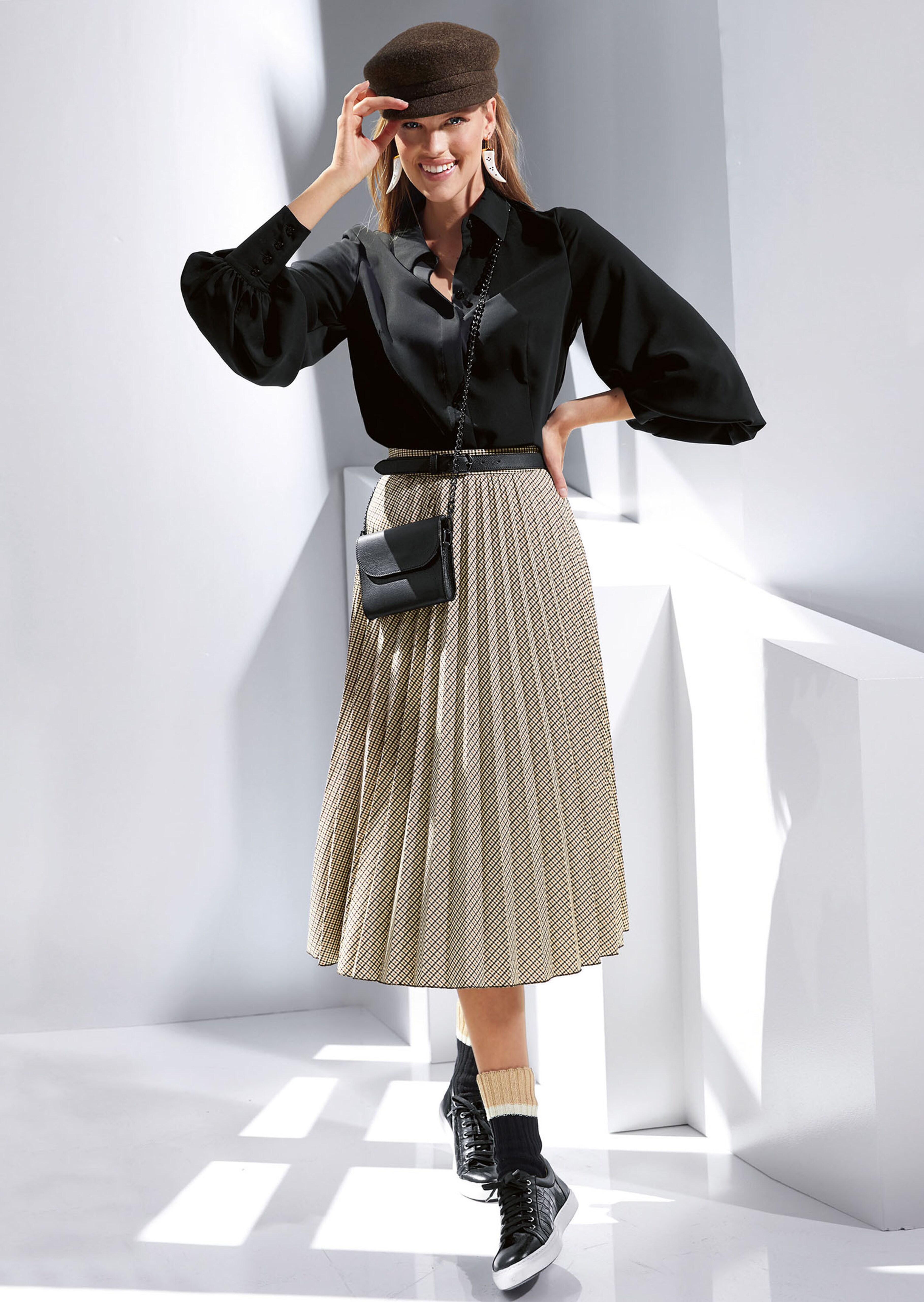 Der Plisseerock ist auch in dieser Saison der Liebling der Designer und unerlässlich für feminine Auftritte. Mit typischer Midilänge und viel Weite bringt er Schwung und Esprit in Ihr Outfit. Dabei verleiht ihm das dezente Karomuster die neue trendstarke Aussage. Der verdeckte Seitenzipper sowie der Formbund mit Knopf und Innenbundsicherung gehören zu den perfekten Details. Für einen schönen, weich fliessenden Fall ist der Rock gefüttert. Gekonnt kombiniert ist der Plisseerock ein Traumpartner für jede Figur und jeden Anlass – vom souveränen Classic-Style über lässig modernen City-Look bis eleganten Event-Stil. Ihrer Kombivielfalt sind keine Grenzen gesetzt.