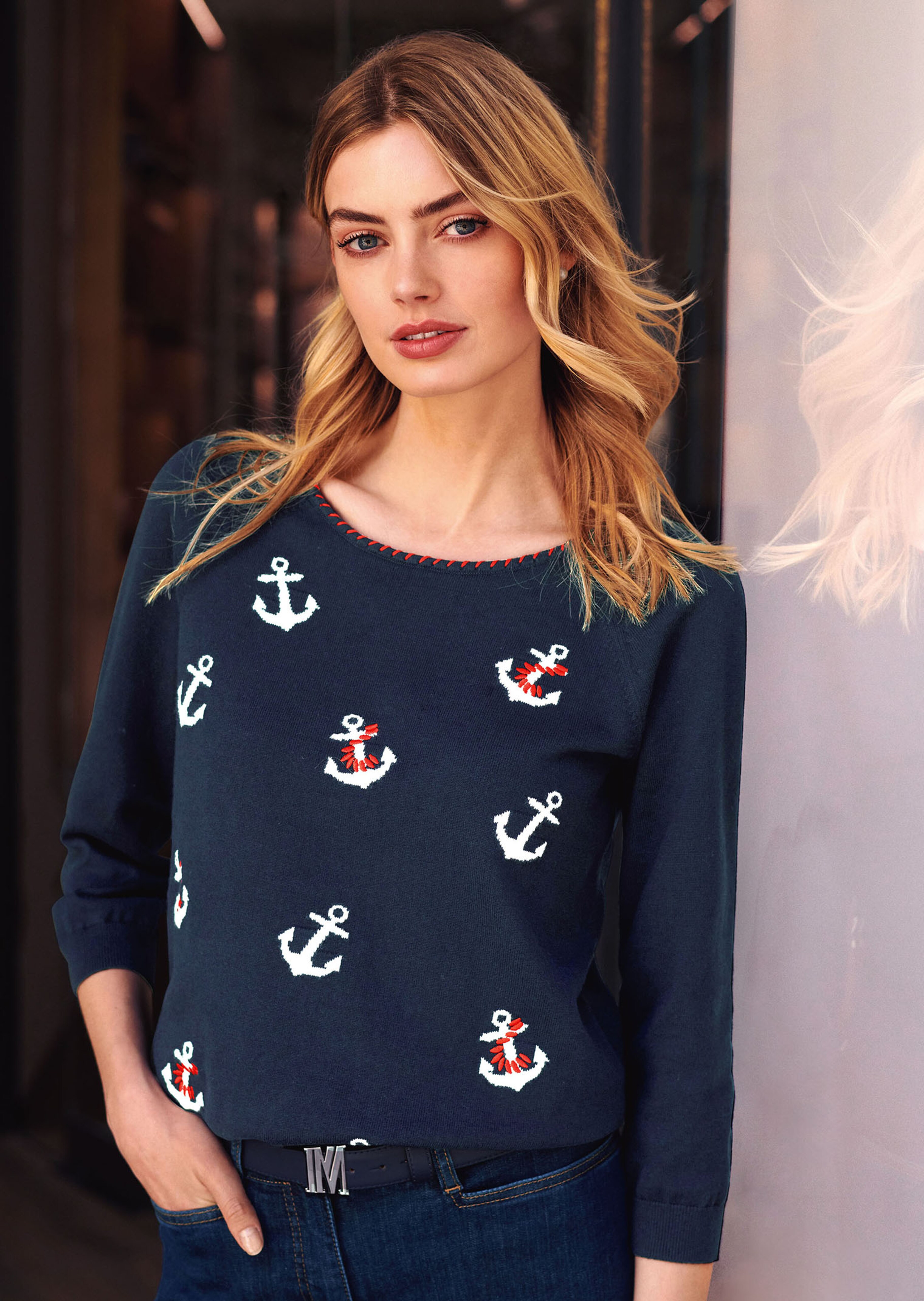Maritime Looks sind nicht nur auf See ein Inbegriff für Stil und Klasse. Der flach in Form gestrickte Pullover wirkt durch seine vielen aufgestickten Anker im Body so kunstvoll. Wir haben ihn für einen femininen Look mit Rundhalsausschnitt und verkürzten, geraden Raglanärmeln gestaltet. Der Strick trägt sich sehr angenehm. Ob auf der Kreuzfahrt, an der See oder als moderner Hingucker: der Strickpullover ist ein Must Have!