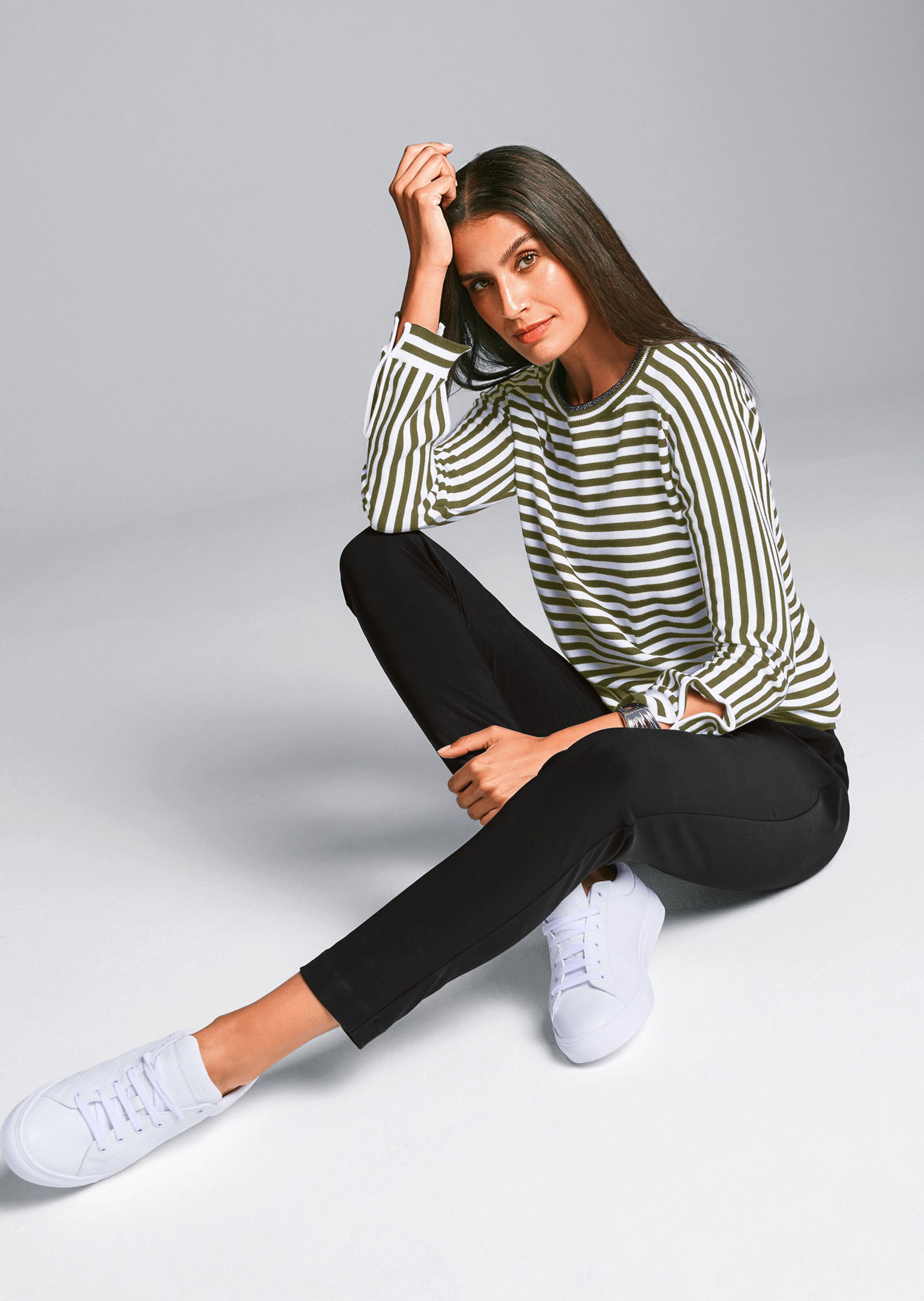 Ein Pullover, der mit seiner Detailgestaltung Raffinesse zeigt. Der Ringelpullover mit langen Ärmeln hat am Armabschluss einen effektvoll gestalteten Schlitz. Der U-Boot-Ausschnitt ist mit feinem Glanzgarn akzentuiert. Der kühle Formstrick aus reiner Baumwolle trägt sich herrlich angenehm und natürlich. Kombinieren Sie den Baumwollpullover zu tonigen Partnern für einen entspannten Casuallook mit Effekt.