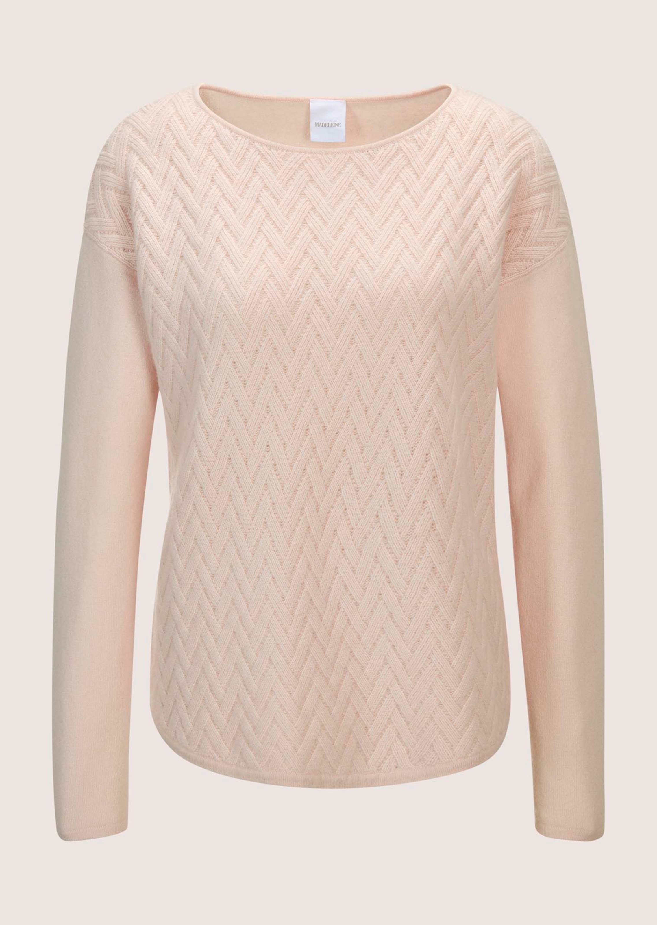 Ein stilvoller Begleiter, der luxuriösen Tragekomfort mit feinsinniger Gestaltung vereint. Die Kombination aus Schurwolle und Kaschmir ist wunderbar flauschig im Griff, während der Schnitt sanft die feminine Silhouette umspielt. Die Vorderseite begeistert mit einem kunstvoll eingestrickten Jacquard-Muster, das dem Modell edle Struktur verleiht. Rückseite und Ärmel sind in glattem Maschenbild gehalten und bilden einen sanften Kontrast zur strukturierten Front. Ein Zusammenspiel aus Ruhe und Eleganz. Der grosszügige Rundhals-Ausschnitt wirkt modern und offen, ohne an Finesse zu verlieren. Abschlüsse in formstabilem Rippstrick rahmen Hals, Ärmel und Saum hochwertig ein und garantieren langlebige Passform. Ein edler Strickpartner, der sich mühelos in jede anspruchsvolle Garderobe einfügt. Vielseitig kombinierbar, geschmackvoll im Ausdruck und ideal für viele Gelegenheiten.