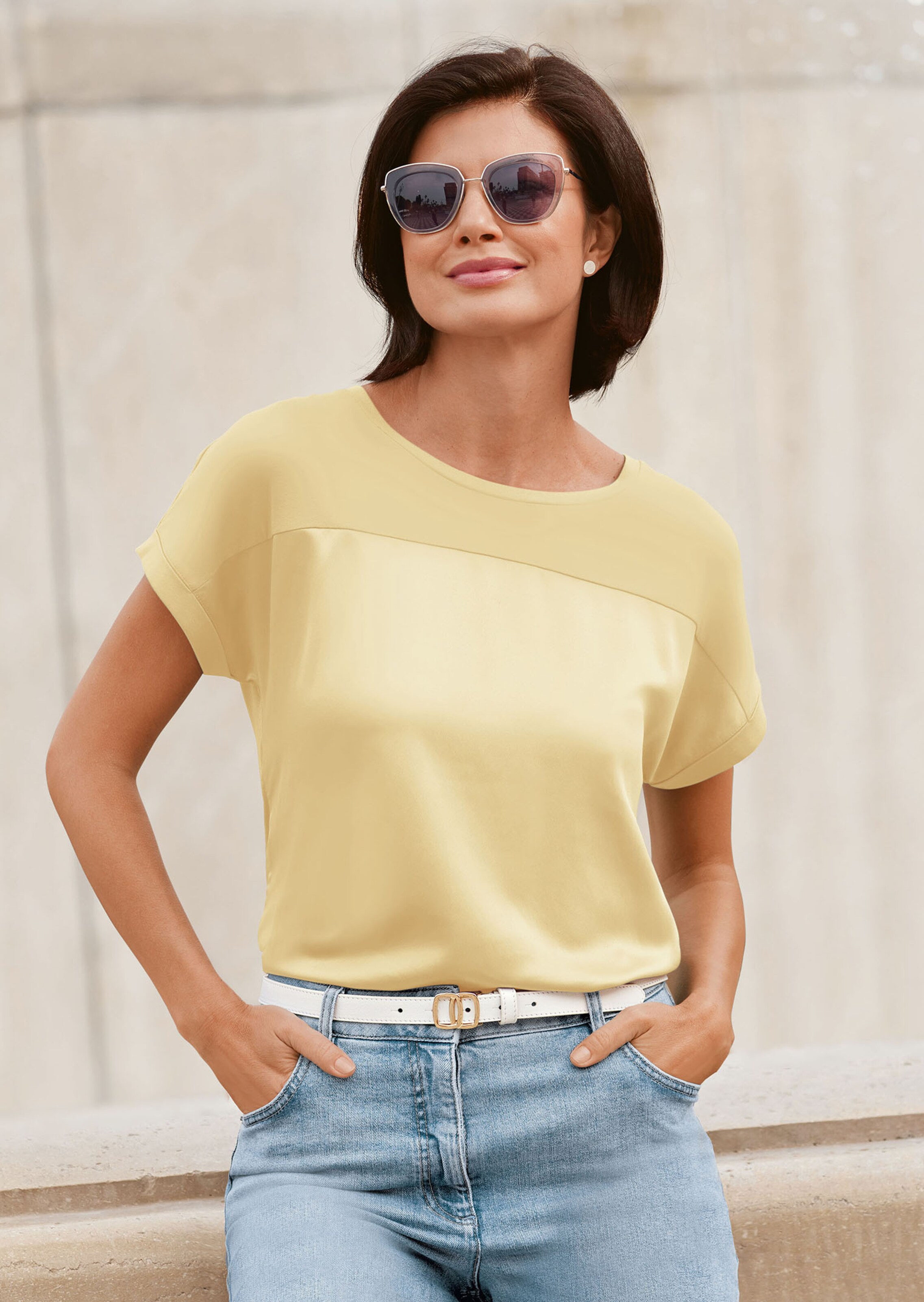 Hier setzt der Qualitätsmix den Trend! Das Satinshirt mit kurzen Ärmeln wirkt so edel durch den Mix aus fein schimmerndem Satin und elastischem nachhaltigem Jersey. Der Qualitätsmix trägt sich herrlich angenehm. Wir haben es für einen modernen Look mit Rundhalsausschnitt, Ärmelaufschlag und überschnittener Schulter gestaltet. Kombinieren Sie es zu ähnlichen Tönen oder im Kontrast für einen Edellook mit Klasse. Mit nachhaltigen Viskosefasern der Marke LENZING™ ECOVERO™.