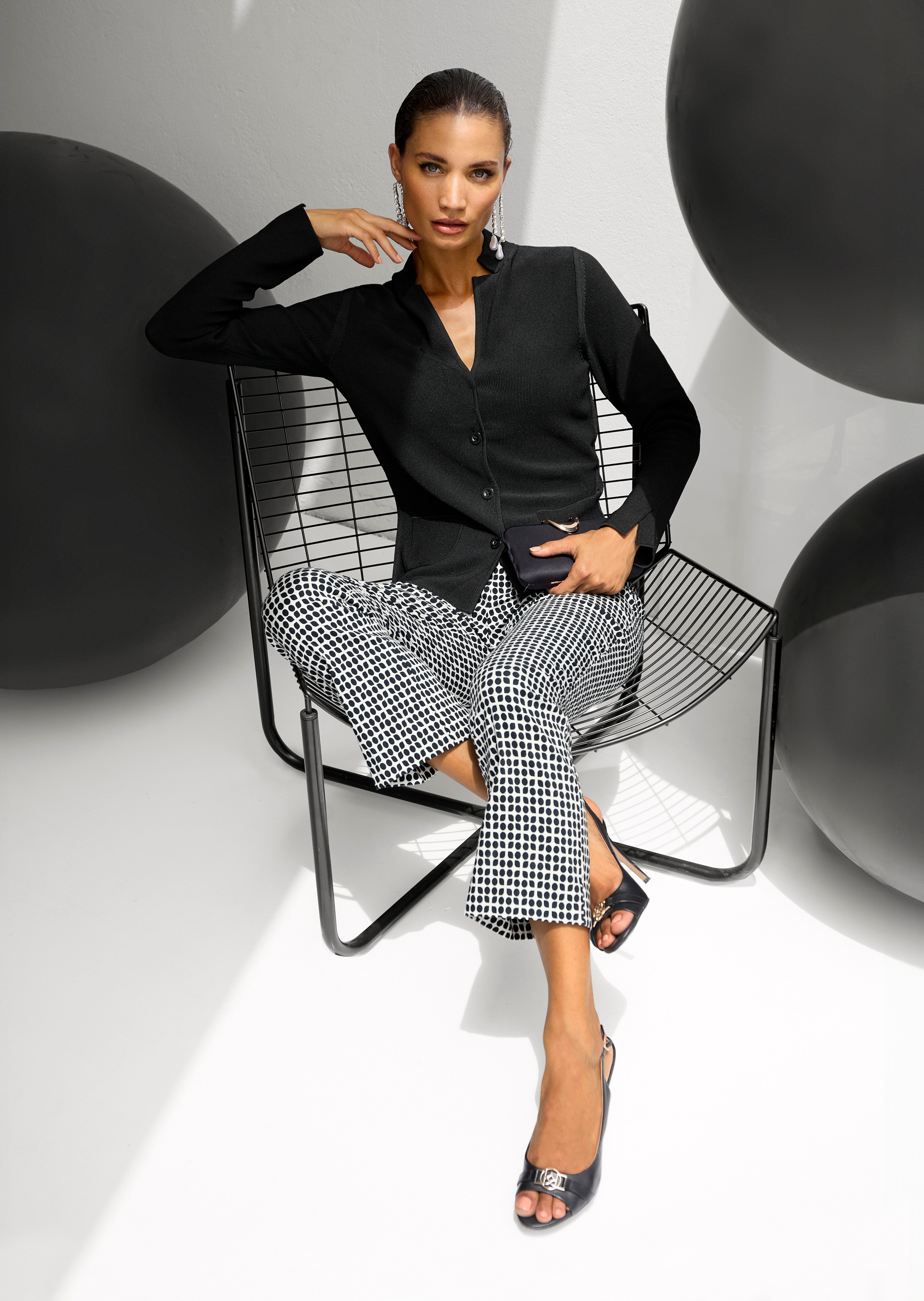 Der Blazer präsentiert sich diese Saison in bequemem Strick. Durch sein modernes Understatement ist er das perfekte Basic für den sportlich eleganten Stil. Der hohe Viskose-Anteil prägt das herrlich kühle Tragegefühl und verleiht der körnigen Struktur einen dezenten Glanz. Unkompliziert und figurnah in der Linie zeigt sich der Strickblazer mit zwei aufgesetzten Taschen, kleinem Stehkragen und Langarm mit kleinem Saumschlitz. Edle Details belegen den hohen Verarbeitungsstandard: Die Knopfleiste ist mit einer formstabilen Innenstrickblende gedoppelt, während die Seitennähte von feinen Glattstrickreihen betont sind. Ein vielseitiger Kombi-Partner, der Sie selbst bei einem Business-Termin glänzen lässt.