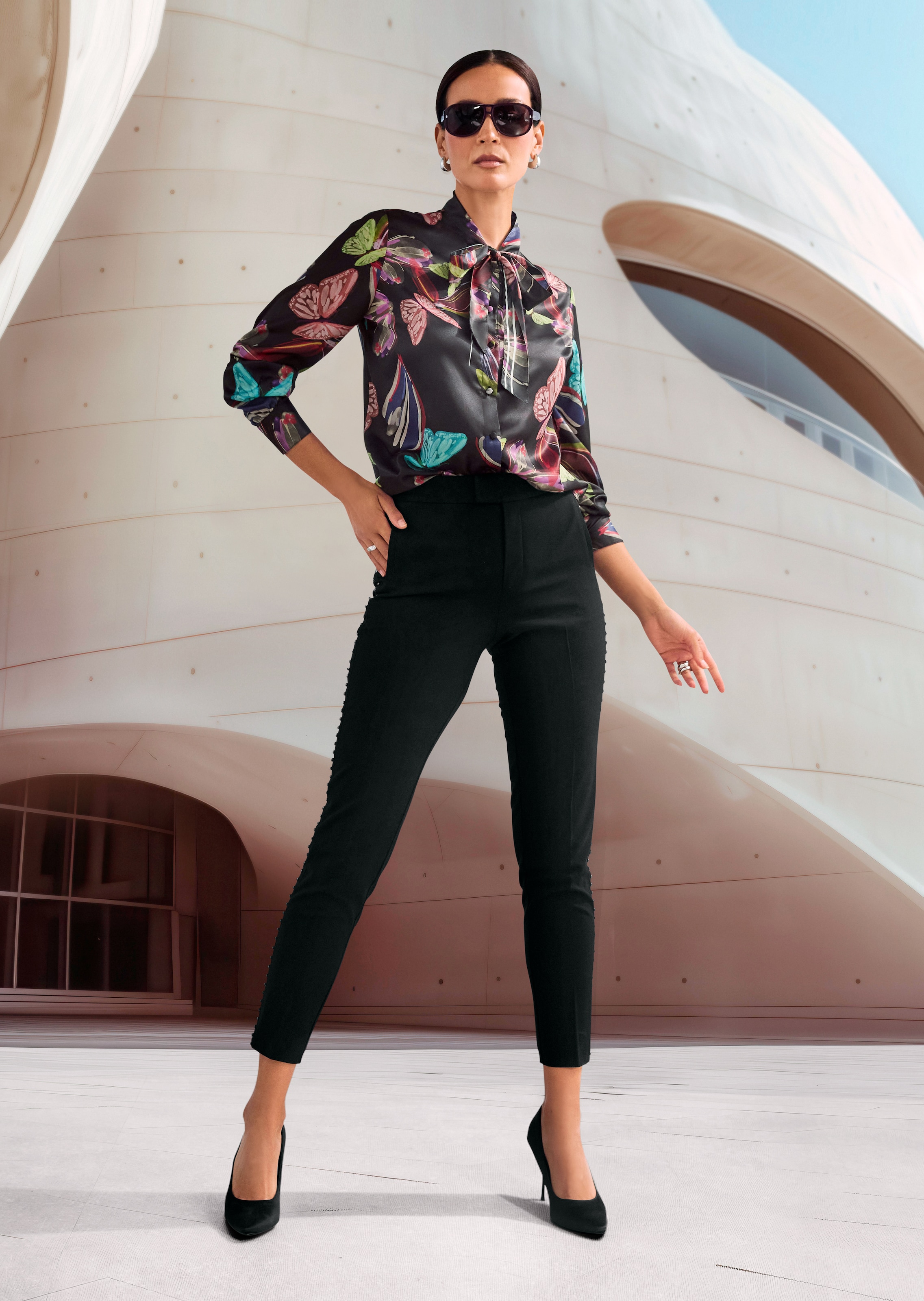 Tropische Extravaganz und feminine Raffinesse – diese Bluse bringt Farbe und Lebensfreude in Ihre Garderobe. Ihr ausdrucksstarker Dschungel-Print wirkt dabei wie ein kunstvolles Gemälde und setzt leuchtende Akzente. Weich fallend umspielt sie die Figur und wird an Knopfleiste und Ärmelmanschetten von stoffbezogenen Knöpfen veredelt. Liebevolle Details, die von handwerklicher Sorgfalt zeugen. Ein besonderes Highlight ist die am Stehkragen angesetzte Schluppe: Ob kunstvoll gebunden, locker geschlungen oder offen getragen – sie erlaubt individuelle Styling-Variationen ganz nach Stimmung und Anlass. Lange Manschettenärmel und ein gerader Saum vollenden den Look mit klarer Linie und stilvoller Präsenz. Ob als Eyecatcher darunter getragen oder als Solist – diese Bluse verleiht Ihrem Auftritt Charakter und Leichtigkeit zugleich.