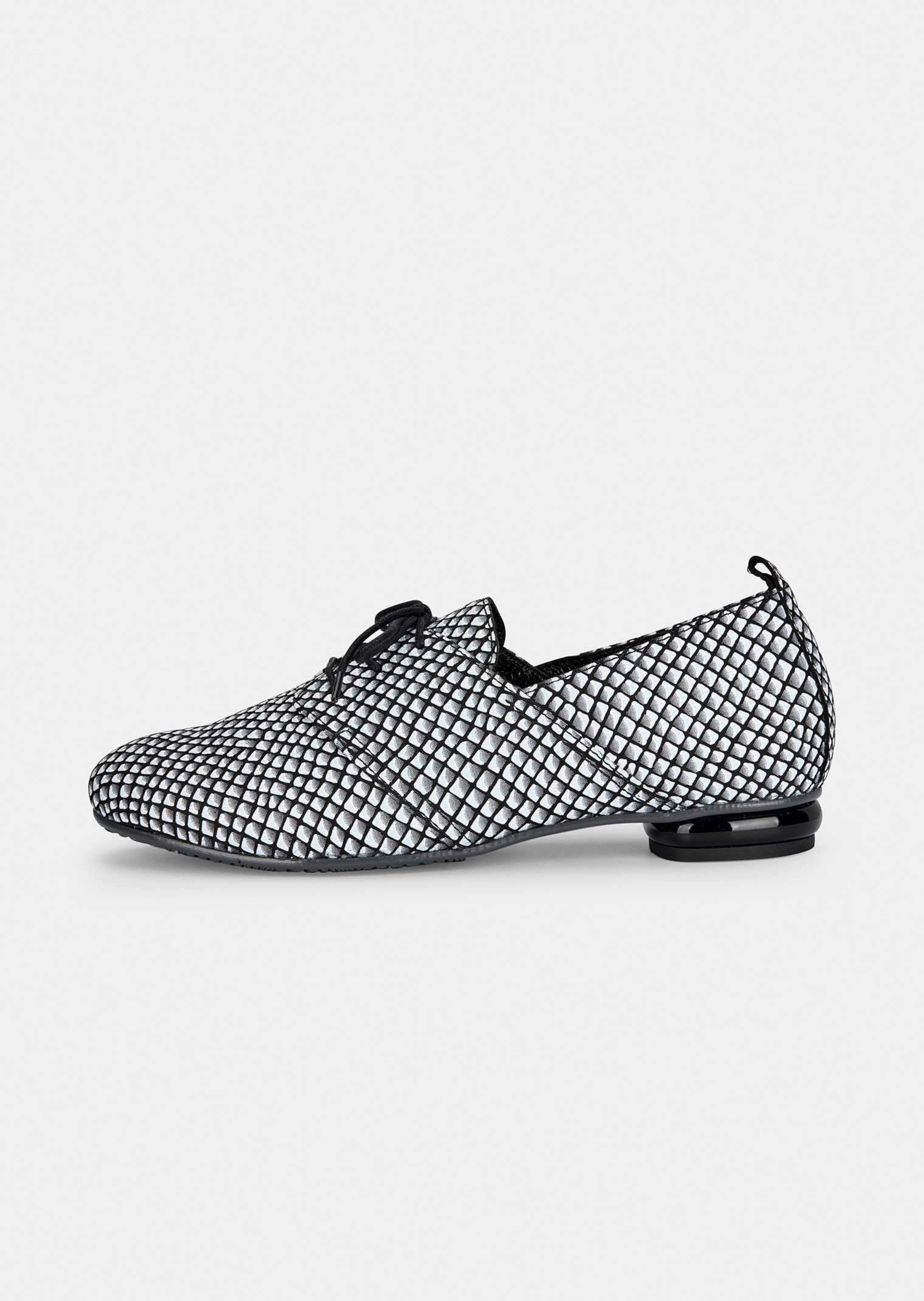Dieser SIMEN-Schnürschuh setzt auf moderne Kontraste: Das grafische Schwarz-Weiss-Muster verleiht eine spannende Tiefe und bringt Bewegung in jedes Outfit. Innen überzeugt das Modell mit Lederfutter und -decksohle für ein angenehmes Tragegefühl. Der flache Blockabsatz sorgt für Stabilität, die Schnürung für variable Anpassung. Perfekt zu minimalistischen City-Looks oder als Eyecatcher zu eleganten Ensembles.