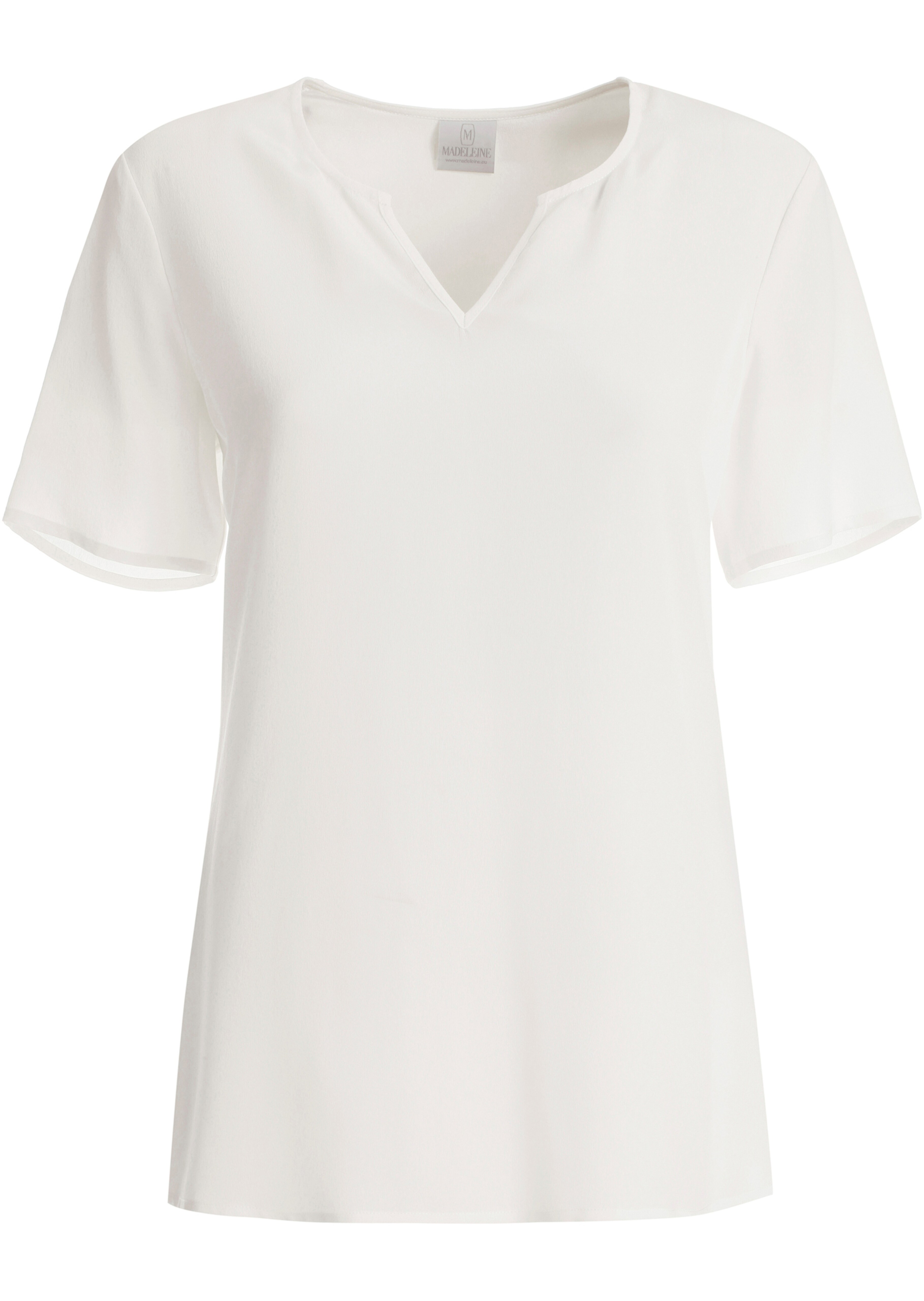 Ein Seidenshirt, das im puristisch eleganten Stil seine ganze Wertigkeit offenbart. Kühl und weich fliessend aus luxuriösem Crêpe de Chine trägt es sich angenehm auch an warmen Sommertagen! Leicht tailliert und stilvoll in der Linie präsentiert es sich mit kurzen Ärmeln und markantem V-Cut, der am Rundhals-Ausschnitt für das modische Statement sorgt. Der feine Mattglanz ist ein typisches Merkmal der kostbaren Qualität. Tragen Sie das weiche Shirt zu eleganten Businesspants oder auch ganz feminin – ganz nach Anlass und Modelaune. Edel in der Farbgebung können Sie es stilvoll zur gehobenen Garderobe kombinieren.