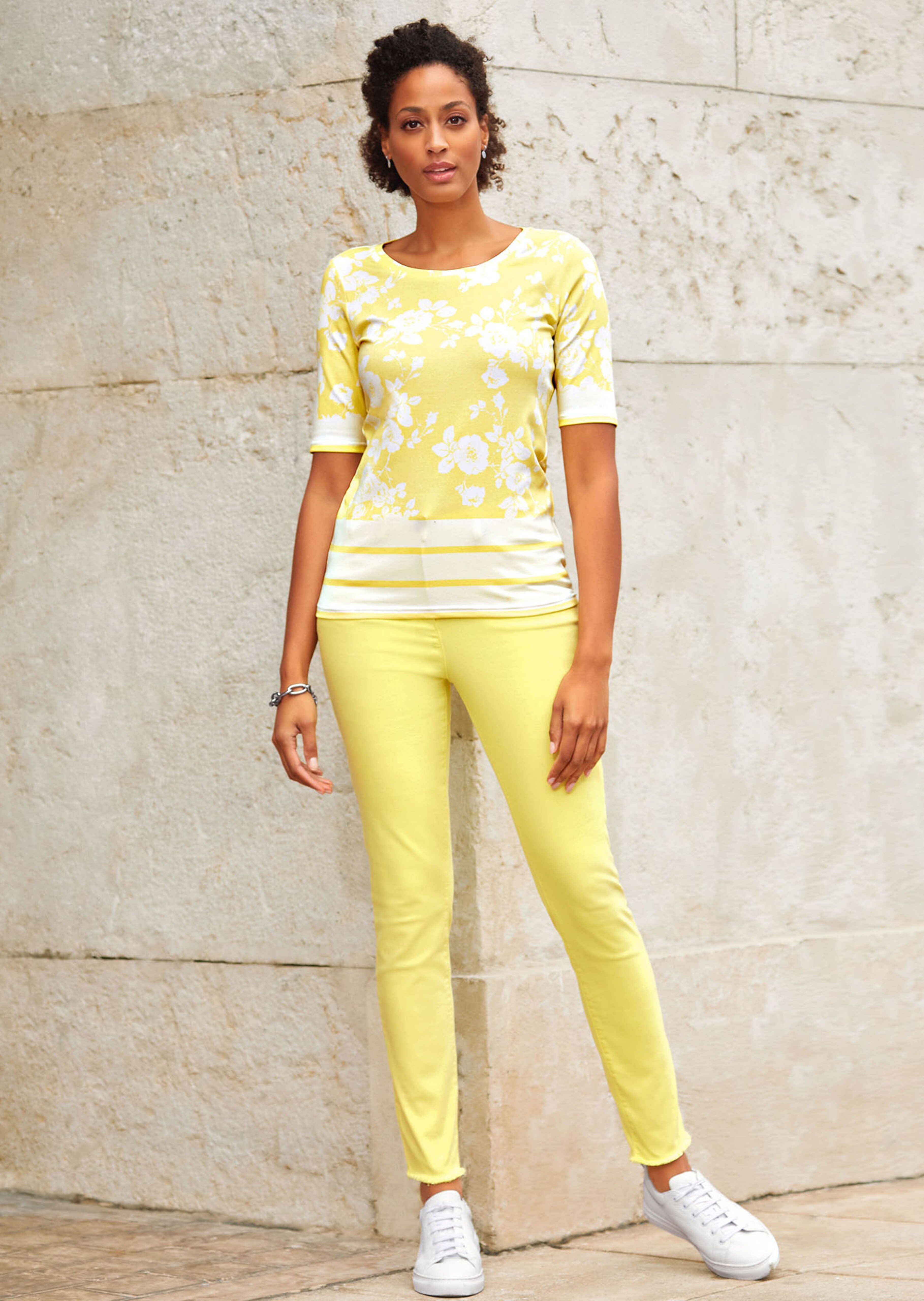 Feminin-Fashion im zarten Ton: Das Shirt mit Blumenmuster gibt auch entspannten Stylings ein charmantes Extra. Der Cottonstretch trägt sich angenehm kühl und natürlich auf der Haut. Der zarte Print macht aus jedem Stück ein Unikat. Kombinieren Sie es zu strahlendem Weiss oder auch ganz lässig zu Denims.