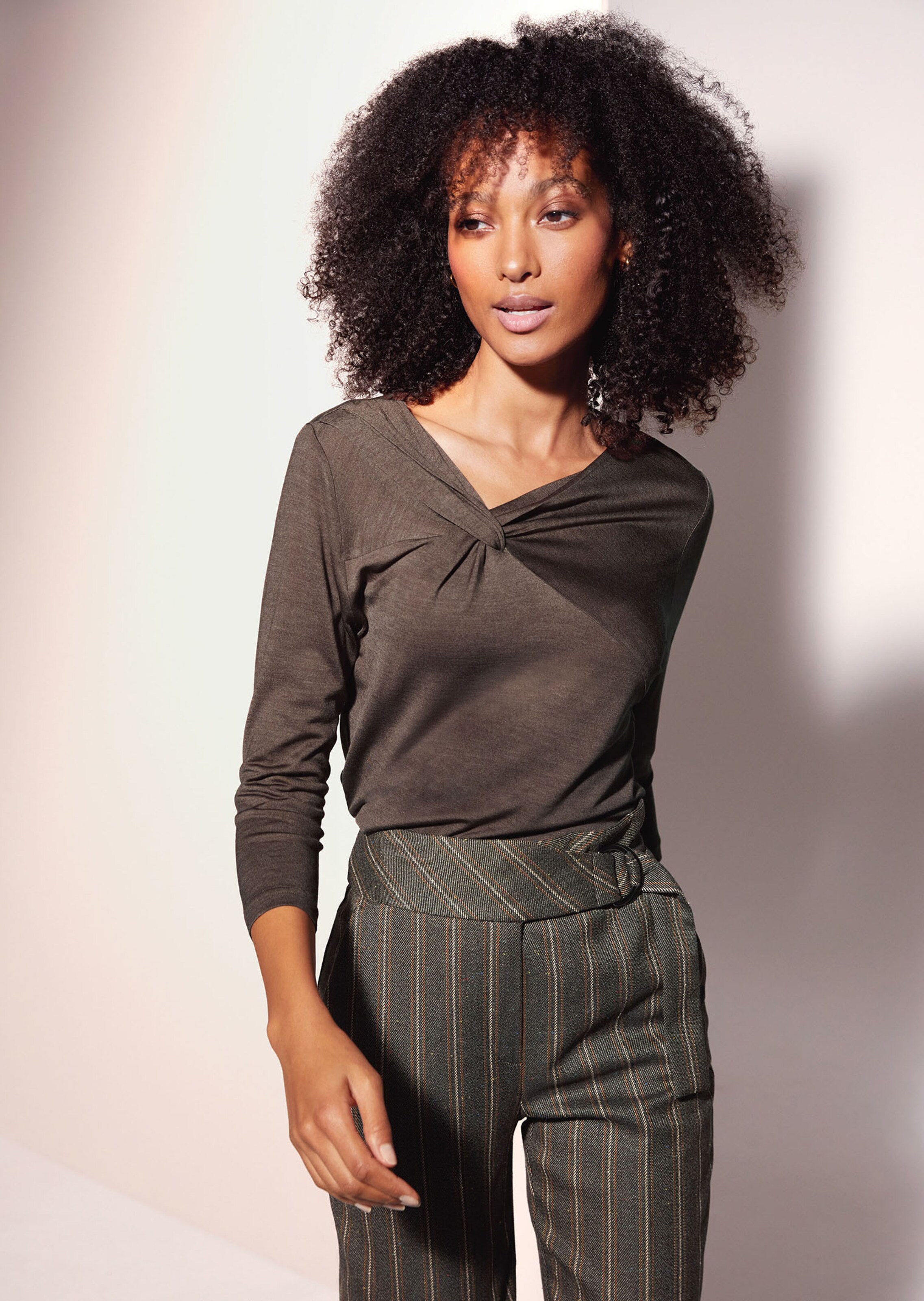 Ein zauberhaft feminines Shirt, das schmeichelnd die Figur betont und mit edlem Look begeistert. Die Garnmischung aus Wolle und Seide macht das Tragen zum reinsten Vergnügen und fasziniert mit edlem Glanz. Der V-Ausschnitt, der von einer aufwendig gearbeiteten Knoten-Drapierung in Szene gesetzt wird, bringt wie die raffiniert platzierten Teilungsnähte Glanz und Eleganz in den Look und macht aus dem Basic-Style ein echtes Fashion-Statement. Figurnah in der Linie wird das Lieblingsstück von modischen 3/4-Ärmeln ergänzt und sollte in keiner anspruchsvollen Garderobe fehlen.