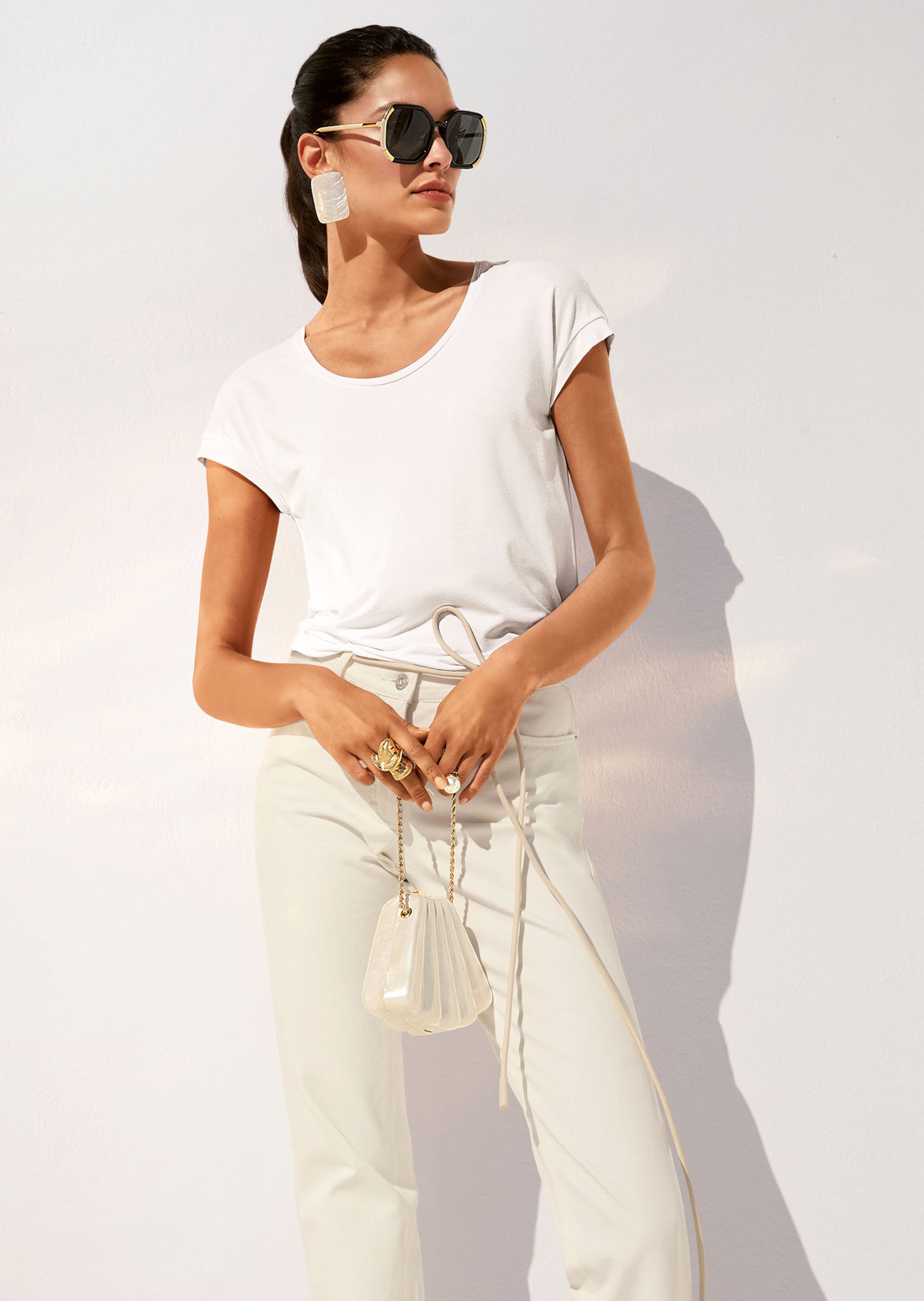 Schlicht, edel und modisch leger: Dieses Shirt zeigt alle Attribute eines modernen Klassikers. Der softe Jersey aus Viskose und Elasthan verleiht nicht nur das angenehme Hautgefühl, sondern auch den geschmeidigen Fall und feinen Glanz. Mit sorgfältig paspeliertem Rundhals-Ausschnitt und überschnittener Schulter ist das Shirt auch zum Unterziehen ein idealer Partner. Ein Basic-Shirt für alle Kombi-Fälle – vielseitig und kofferfreundlich wird es Sie durch mehr als eine Saison begleiten.