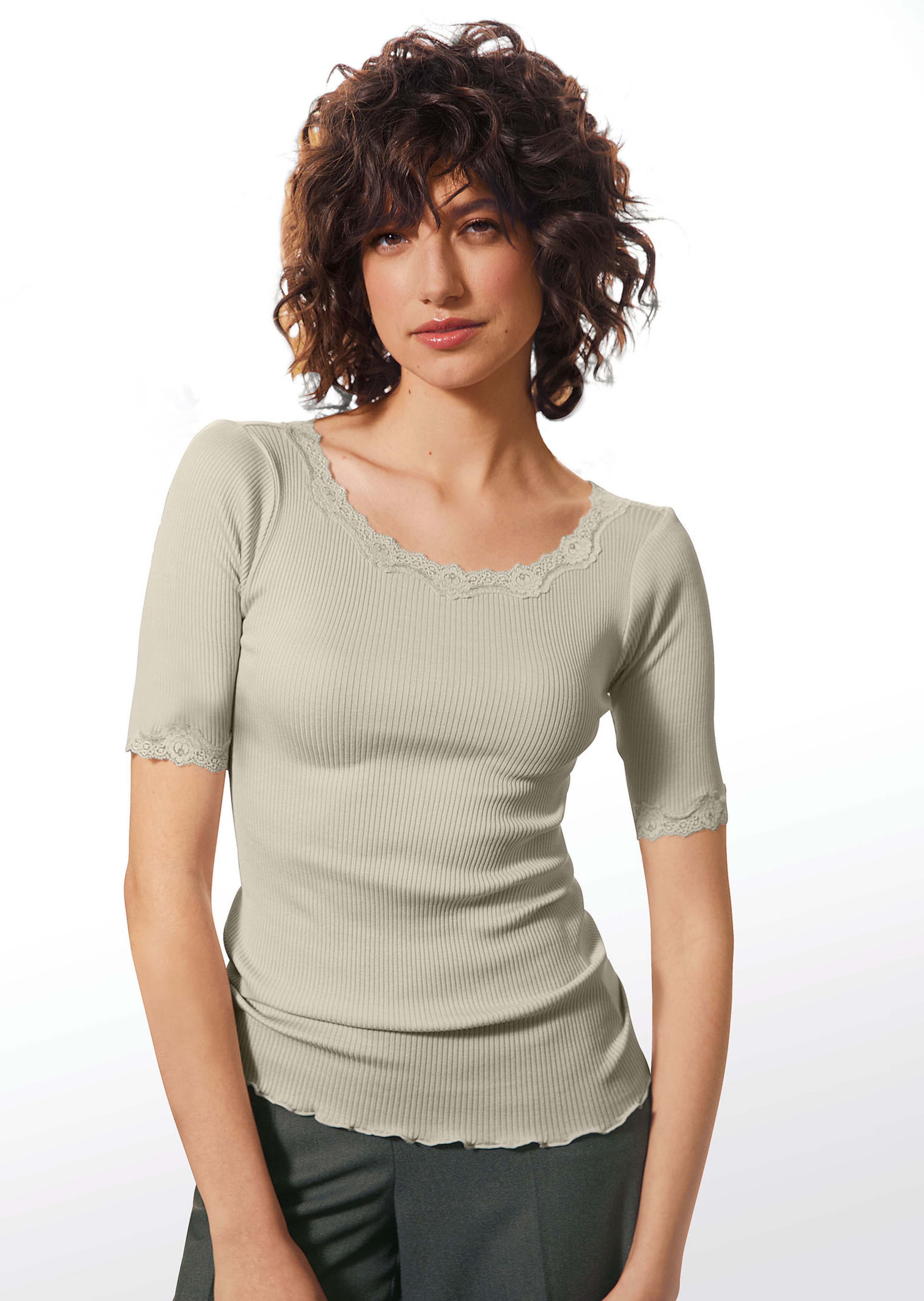 Fantastisch feminin und luxuriös! Das Shirt mit Spitze und Wellensaum trägt sich durch den geschmeidigen, superelastischen Ripp-Jersey im Seiden-Baumwollmix so herrlich angenehm und weich. Der schlanke Style ohne Seitennähte zeichnet eine schöne, schmale Linie und ist mit Rundhalsausschnitt und Halbarm gestaltet. Tragen Sie es zu zarten Tönen – sehr schön auch zu den gemusterten Modellen der Saison – für einen femininen, luxuriösen Look.
