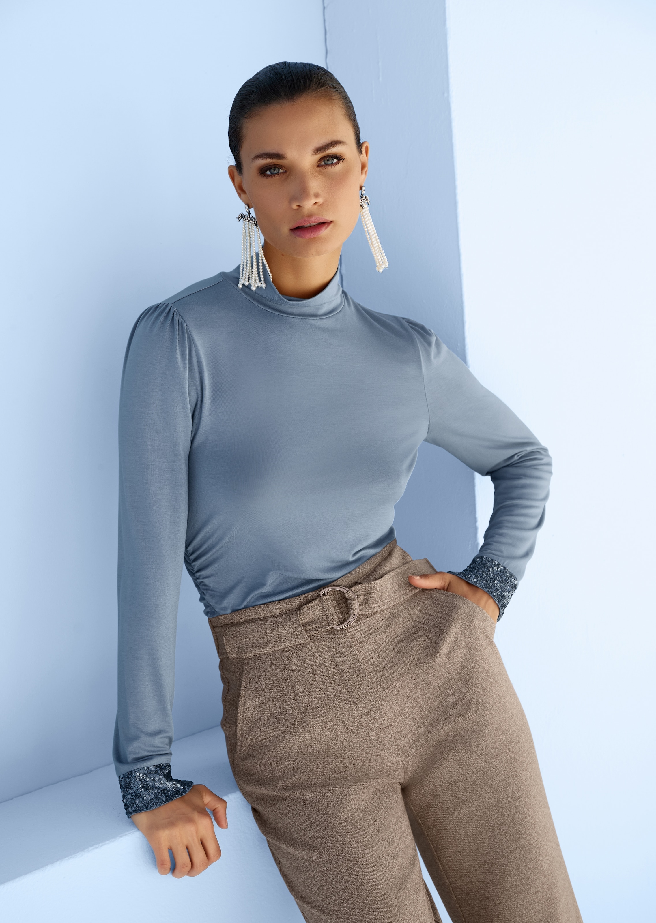 Entdecken Sie ein modisch legeres, feminin tailliertes Langarm-Shirt mit stilvollem Stehkragen. Die mit funkelnden Pailletten besetzten Manschetten der Ärmel sind lässig geschlitzt und bringen Glanz und Raffinesse in den Look. Die leicht gekräuselten Schulter- und Seitennähte zeugen von viel Liebe zum Detail und unterstreichen den eleganten, aber entspannten Stil. Die bequeme Stretch-Qualität sorgt für ein angenehmes Trage-Gefühl. Ideal für alle, die sowohl Komfort als auch Stil schätzen.