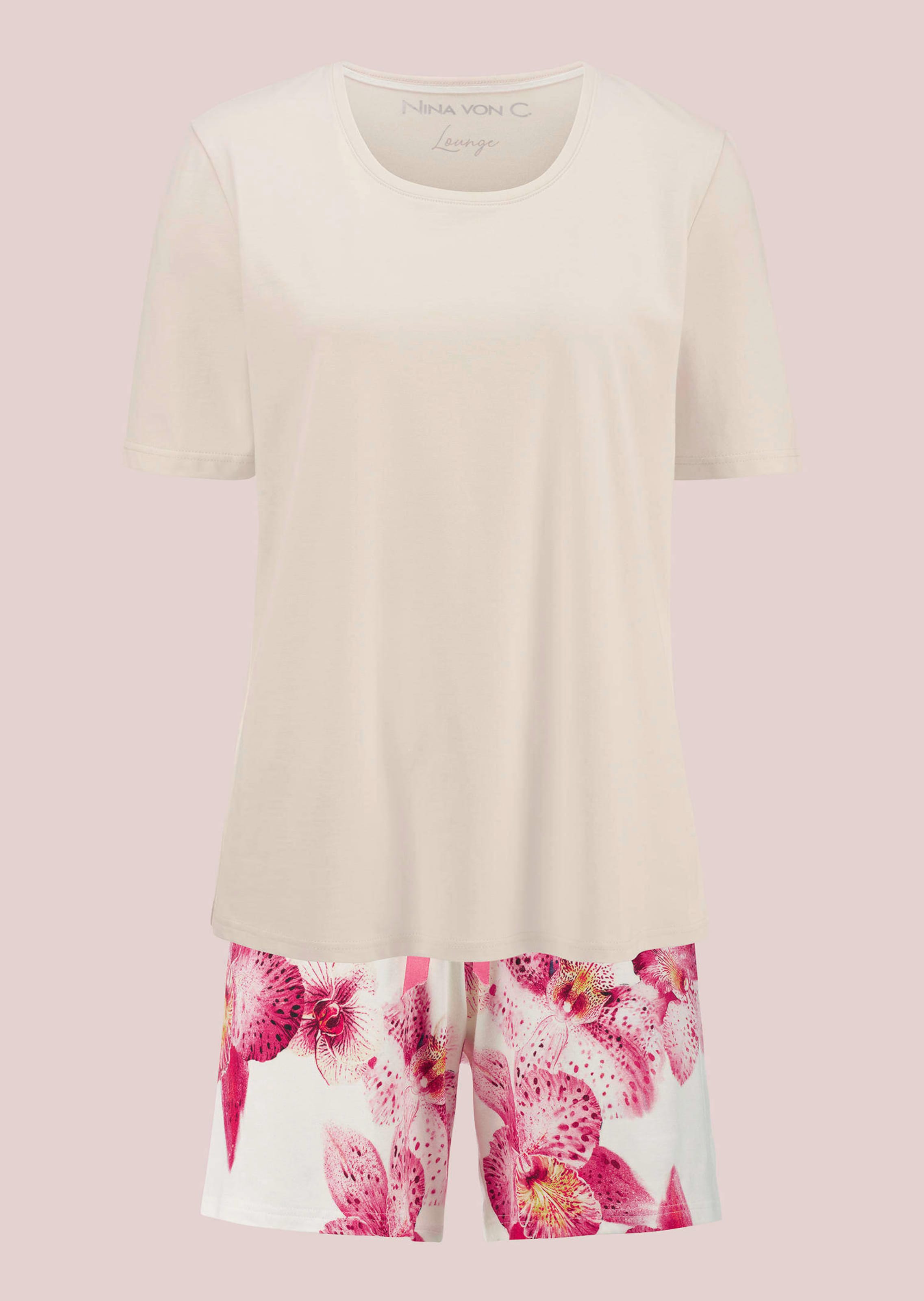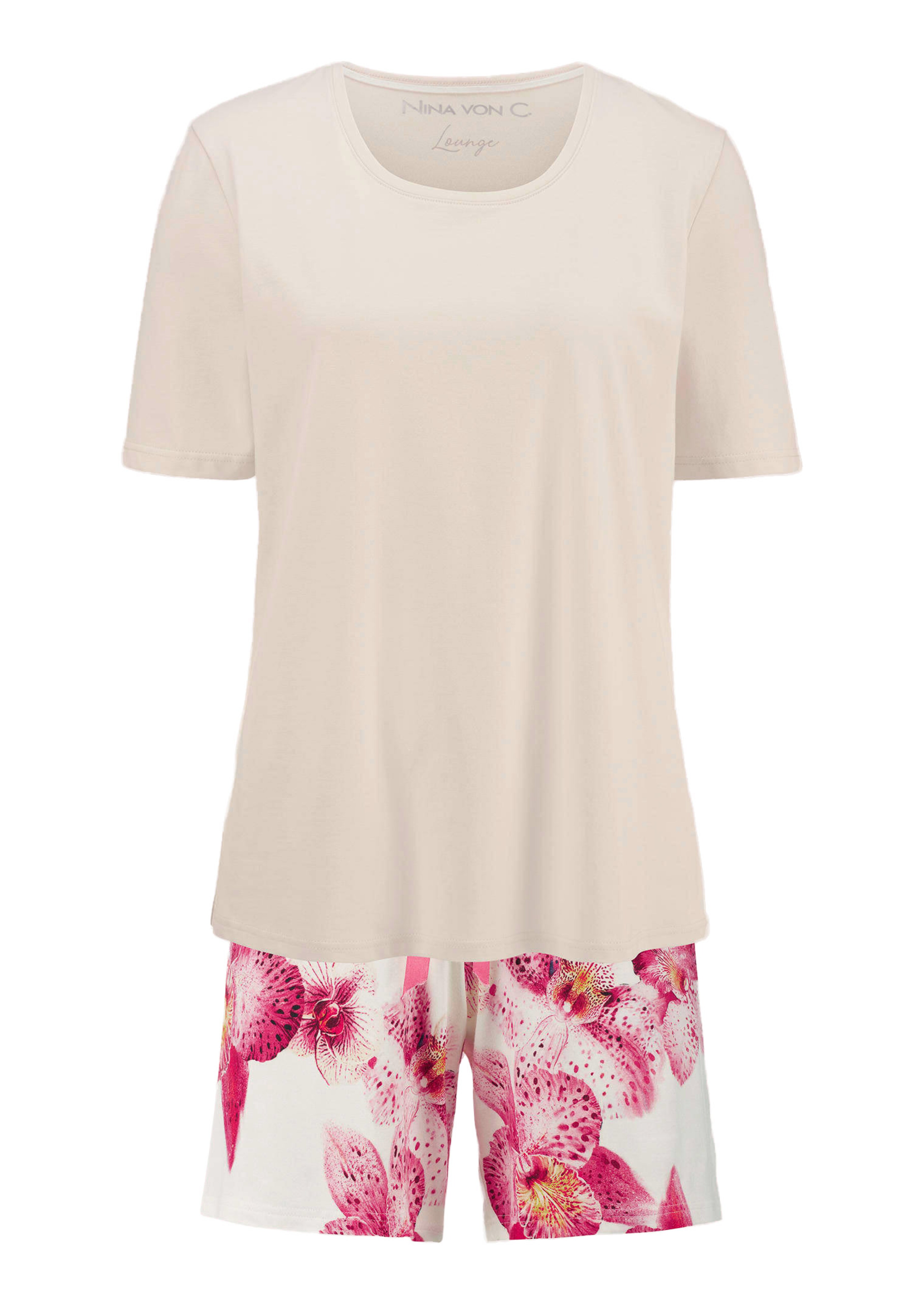 Shorty-Set von NINA VON C. – ein sommerlicher Mix aus Komfort und femininer Leichtigkeit. Das weiche Baumwollshirt mit Rundhalsausschnitt und halblangen Ärmeln schmeichelt der Haut, während die kurze Hose mit floralem Allover-Print charmante Akzente setzt. Dank Schlupfbund und Satinband lässt sich die Weite individuell anpassen. Formstabil und angenehm zu tragen – ideal auch für hohe Temperaturen.