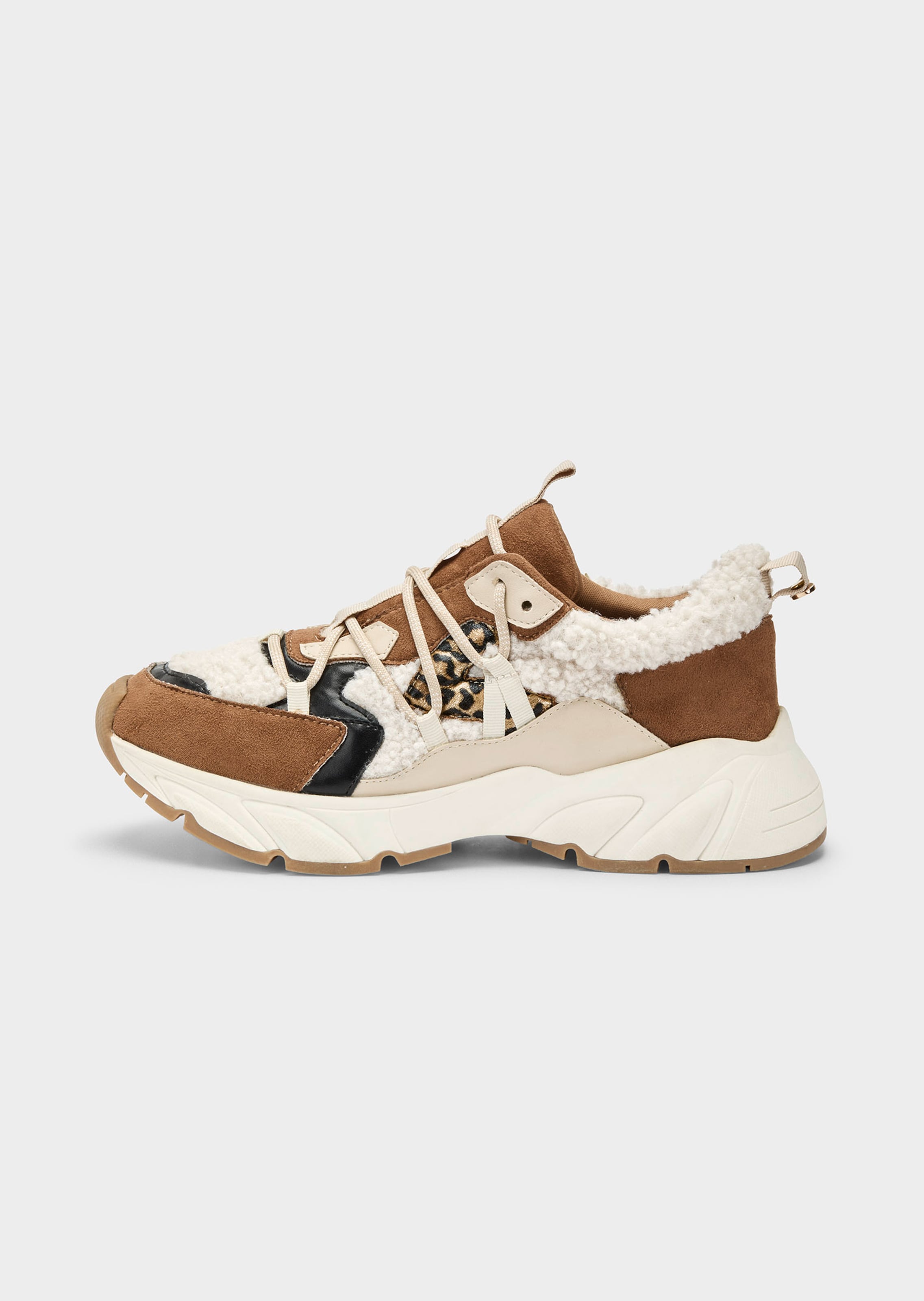 • Materialmix aus Textil, Lederimitat und Teddyfell