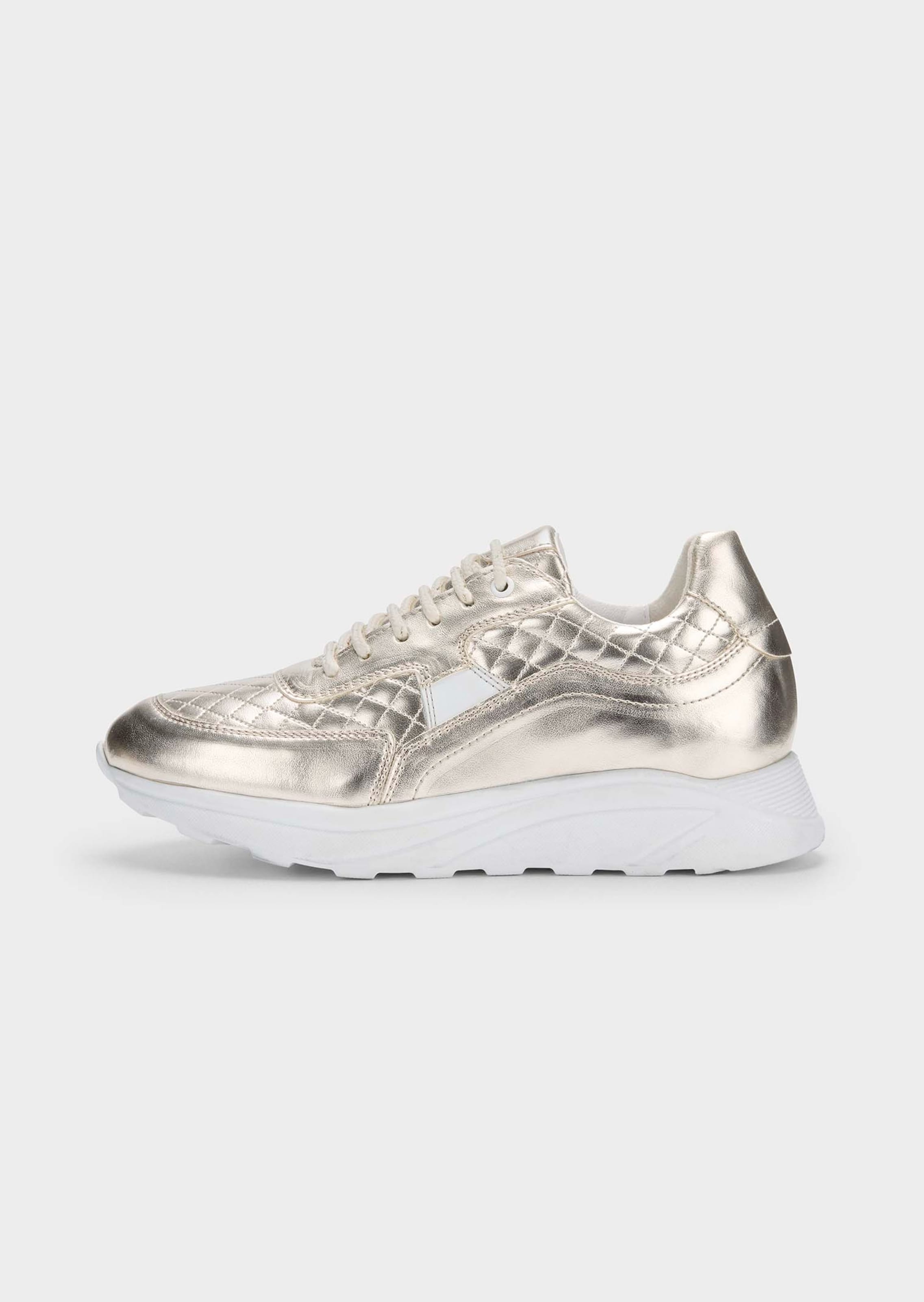 Dieser stylische Sneaker wertet Ihr Outfit modisch auf. Das Obermaterial aus hochwertigem Leder glänzt in einem edlen Goldton, während die Schnürung und die perforierte Optik einen sportlichen Look verleihen. Die Innenausstattung aus Textil und die rutschfeste TR-Laufsohle sorgen den ganzen Tag für bequemen Tragekomfort. Kombinieren Sie den Schuh lässig zu Stoffhosen oder eleganter zu Röcken und Kleidern.