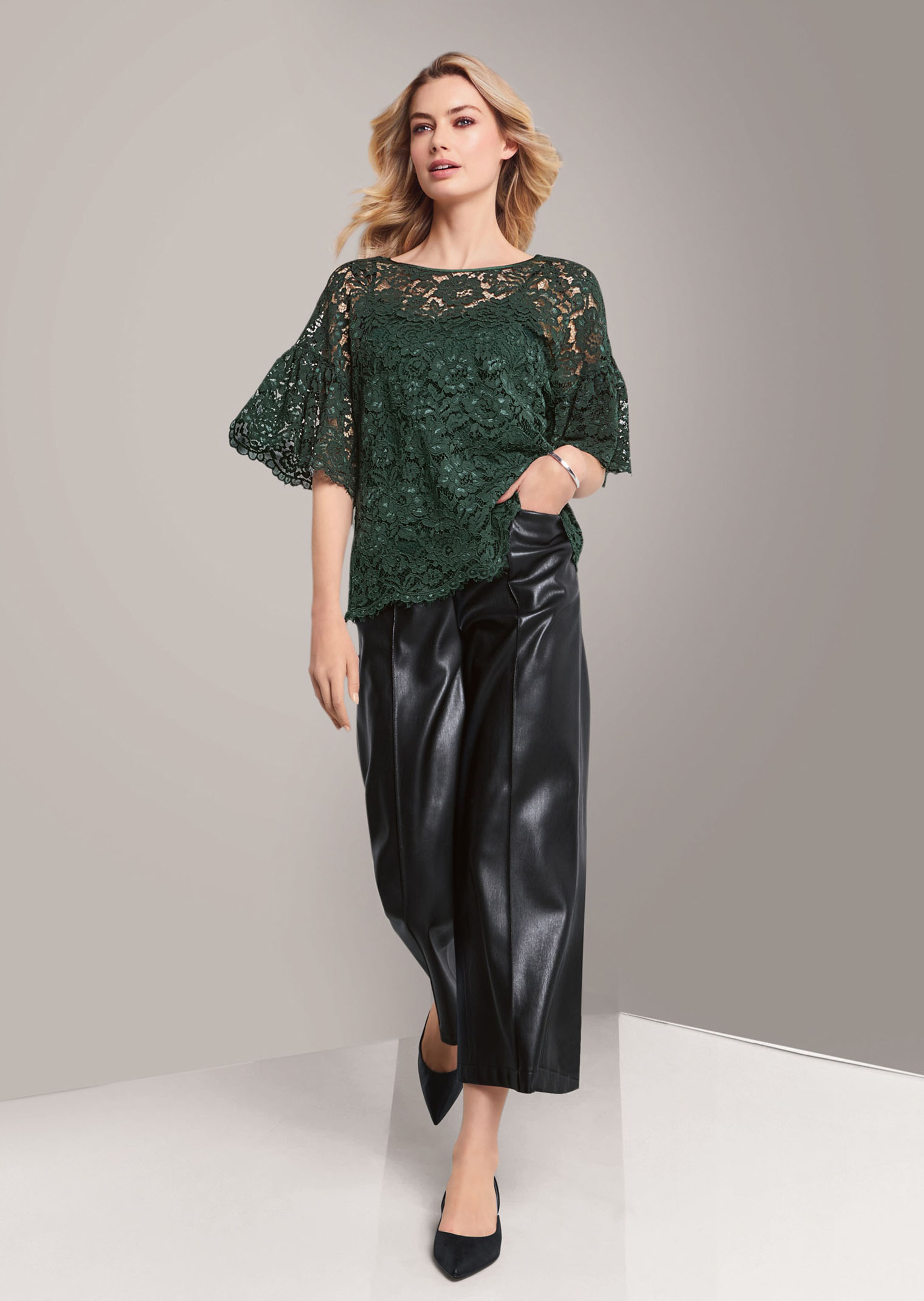 Sie lieben feminine Stylings mit modernem Romantik-Touch? Die Spitzenbluse mit Rüschen lässt fein das Darunter hervorblitzen. Dank des elastischen Jerseytops mit verstellbaren Trägern wird sie blickdicht. Wir haben sie für einen modernen Look im femininen Boxystyle mit Volantärmeln, U-Boot-Ausschnitt, eingefasster Ausschnittkante und eingefassten Innennähten gestaltet. Die wertvolle Spitze trägt sich durch den Mix mit Baumwolle angenehm auf der Haut. Ein raffiniertes Detail sind die BH-Halter: Sie können daran Ihre BH-Träger befestigen, so sitzt die Bluse immer optimal.