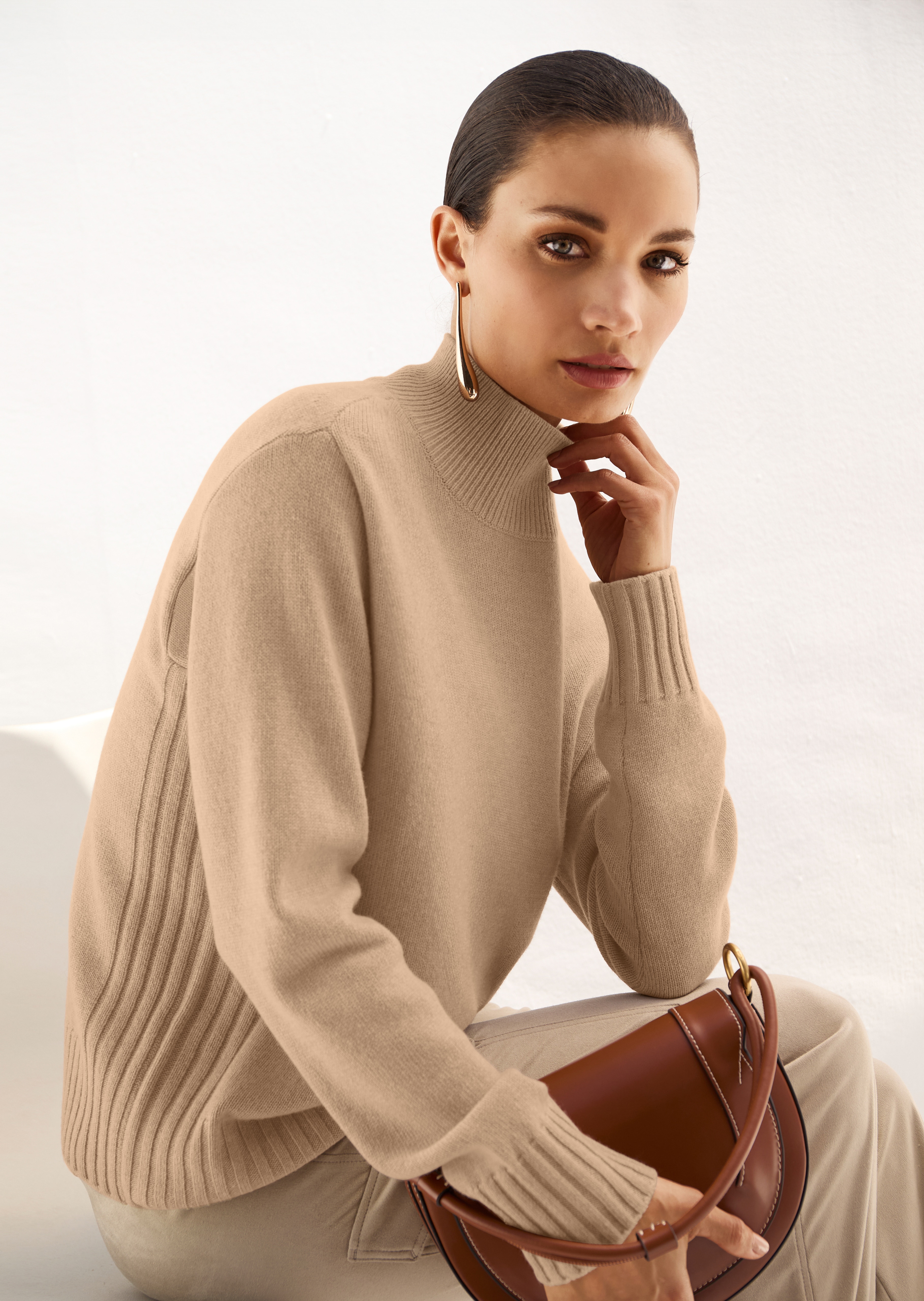 Die hochwertige Wollmischung aus Schurwolle und Kaschmir macht das Tragen dieses Langarm-Pullovers zum puren Vergnügen. Ein echtes Lieblingsstück, das in keinem Sortiment fehlen sollte. Der wertvolle Glattstrick ist an Stehkragen, Ärmelbündchen und Saumkante mit flexiblen Rippenbündchen gearbeitet und bleibt daher immer in Form.
