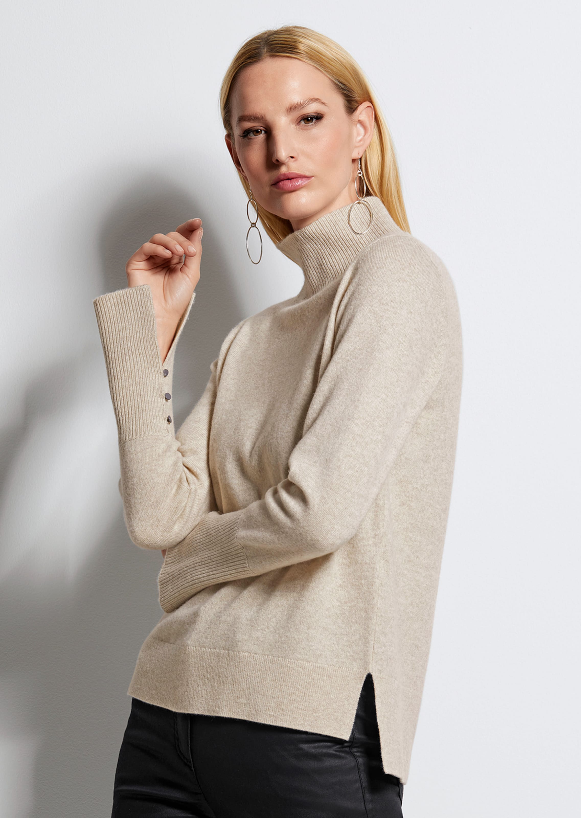Ein vielseitig kombinierbarer Pullover aus hochwertiger Naturgarn-Mischung für ein einzigartiges Trage-Erlebnis. Die leicht taillierte Form mit modischem Stehkragen und trendstark verlängerter Rückseite verleiht dem Strickpartner eine stylische Note, während Seitenschlitze Lässigkeit in den Look bringen. Die langen Ärmel zeichnen sich durch modische Raffinesse aus und sorgen mit einer breiten, geschlitzten Manschette und Knöpfen für das gewisse Extra. Der flauschige Kaschmir-Anteil ist super soft im Trage-Gefühl und verleiht dem Pullover einen edlen Griff.