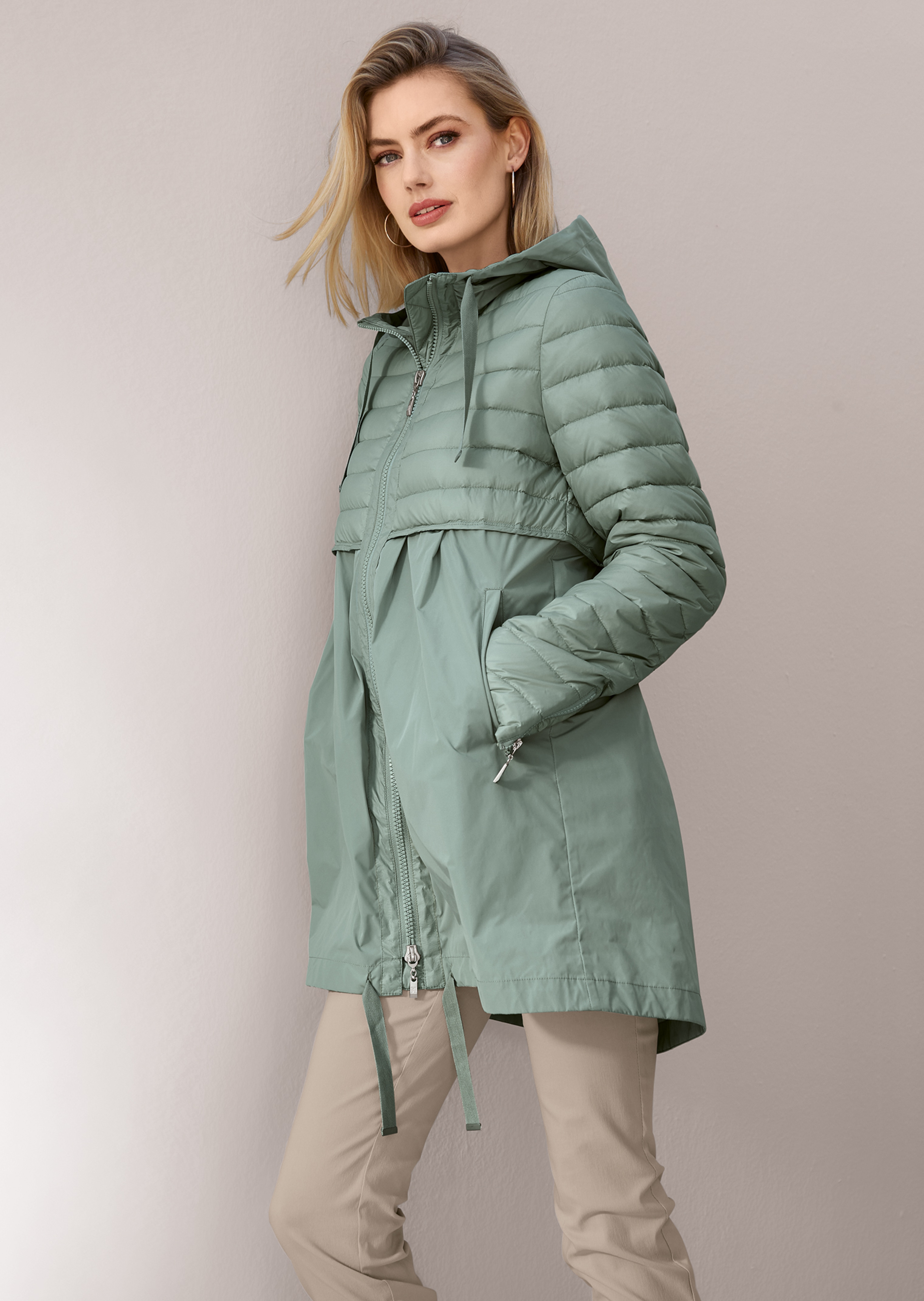 Steppjacken halten nicht nur schön warm, sondern liegen auch absolut im Trend. Dieses Modell überrascht in lässiger A-Linie und farbharmonischem Material-Mix mit einem neuen, supermodischen Auftritt. Ärmel und die obere Partie sind in hochwertigem Sandwich-Stepp gearbeitet. Die softe Daunen-/Feder-Füllung sorgt für angenehme Wärme. Der Rumpfbereich in glatter, ungefütterter Nylonware setzt einen reizvollen Kontrast. Auch die vielen Details überzeugen: Dazu gehören dezente Leistentaschen sowie ein 2-Wege-Zipper und Ärmelzipper mit M-Puller. Tunnelzüge an Kapuze und Saum erlauben ein variantenreiches Styling. Dieses Produkt wurde unter Beachtung weitreichender Tierwohl-Kriterien hergestellt.
