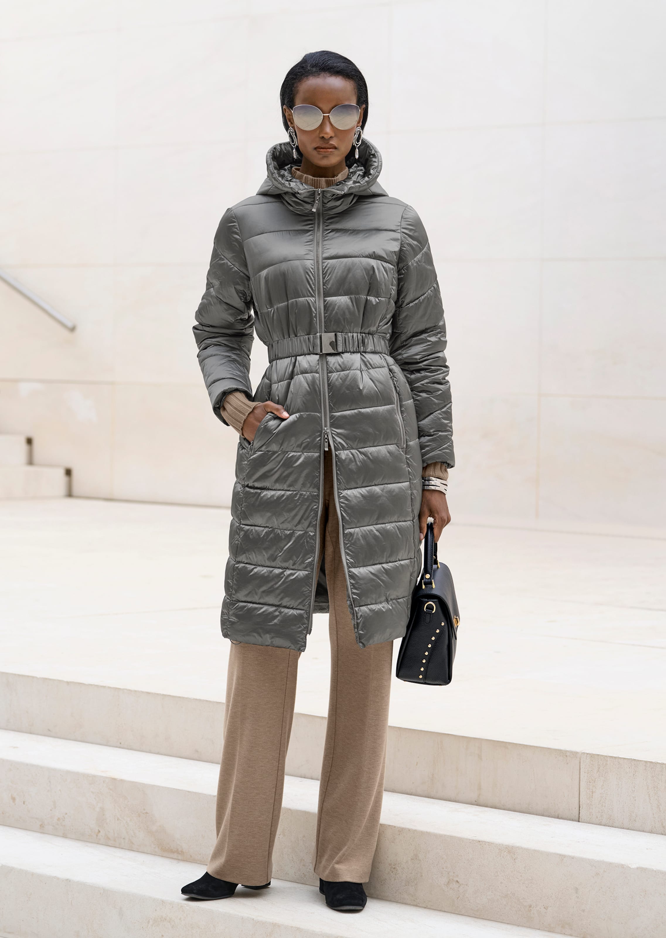 Geniessen Sie die kalten Tage des Jahres mit dieser hochwertig verarbeiteten Steppjacke. Angenehm warm wattiert mit Kapuze und langen Ärmeln ist sie durch einen praktischen Frontreissverschluss zu schliessen. Ein modisch sportiver Look, der vielseitige Kombinationsmöglichkeiten bietet. Für modische Raffinesse sorg der dazugehörige Gürtel, der eine individuelle Taillenbetonung erlaubt.