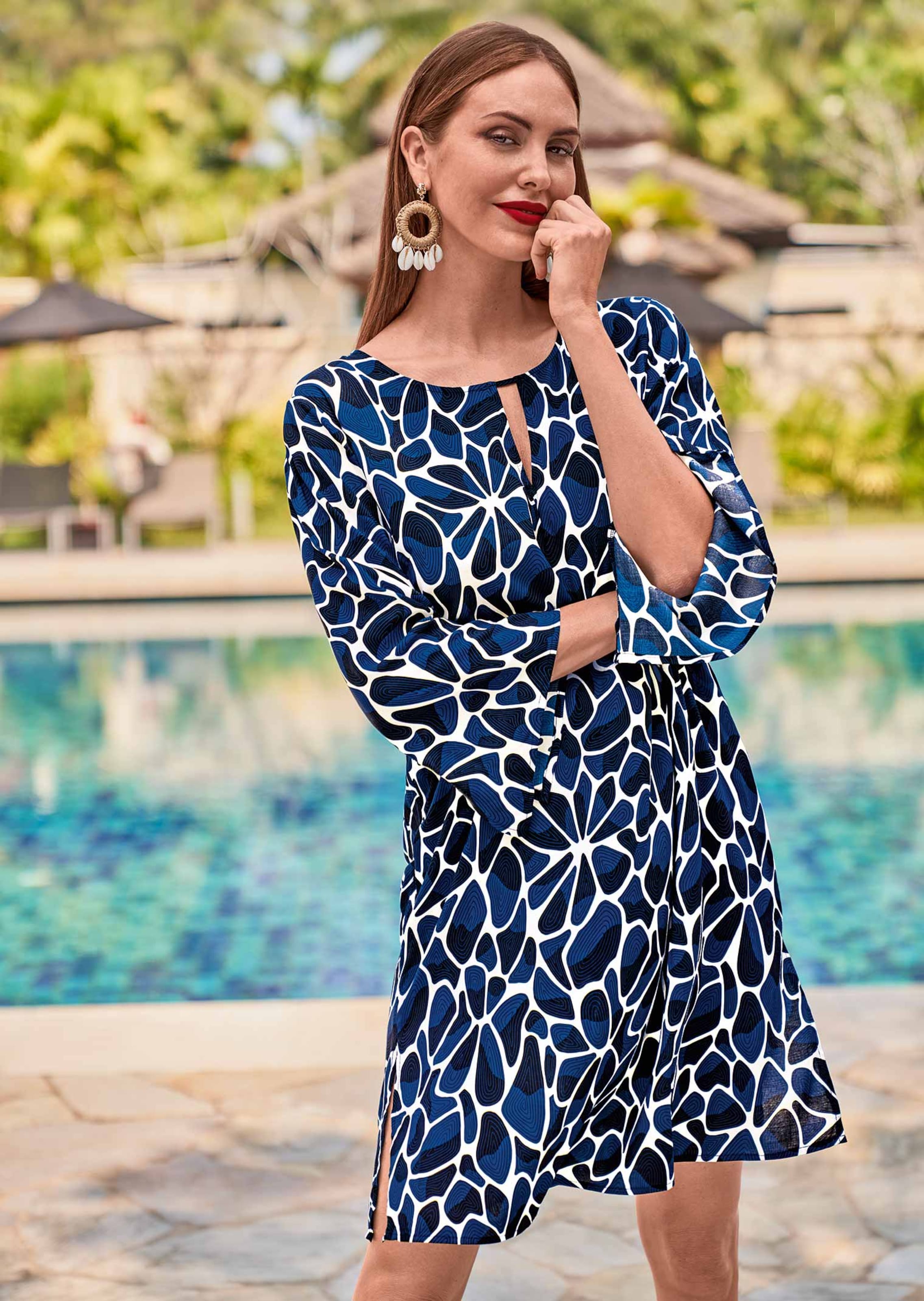 Das Strandkleid von ANITA ist perfekt für heisse Tage: In fliessender Tunikaform aus reiner Viskose fühlt es sich angenehm kühl an und lässt viel Luft an den Körper. Der Rundhalsausschnitt ist mit einem oval geöffneten, mittellangen Formschlitz gearbeitet. Seitliche Eingrifftaschen und Ärmel- sowie Seitenschlitze verleihen dem Modell einen lässigen Look. Mässig weite Ärmel in 3/4-Länge runden das Modell ab.