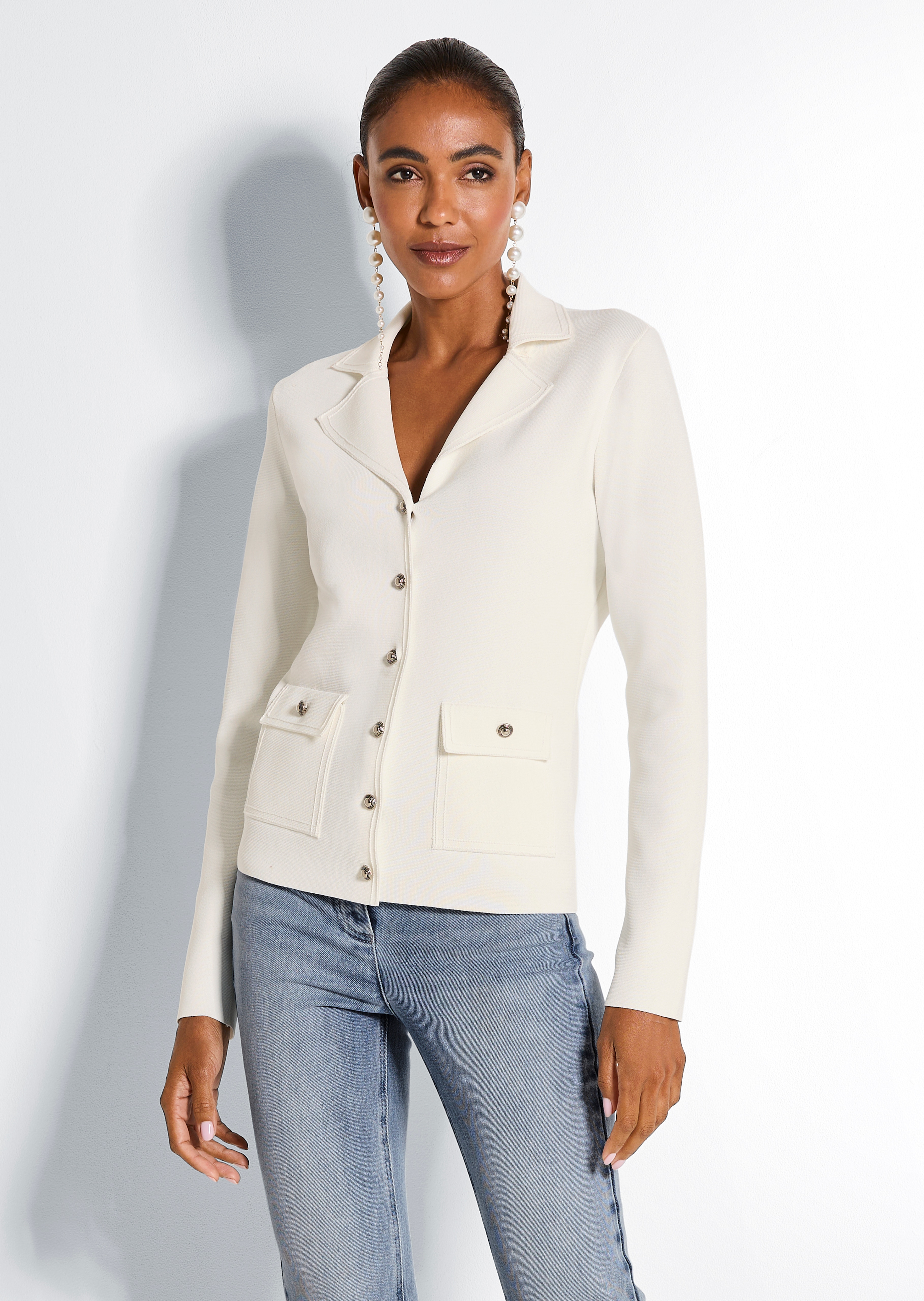 Strickblazer ersetzen Cardigans mit ihrer edlen Optik und bleiben dabei herrlich bequem. Dieses Modell aus formstabilem Milano-Strick – einer besonders dichten, glatten Strickart mit eleganter Anmutung – verbindet ein zeitloses Design mit hohem Tragekomfort. Der klassische Reverskragen, dekorative Schmuckknöpfe und aufgesetzte Pattentaschen bringen Blazer-Charme ins Spiel, während die leicht taillierte Form der Figur schmeichelt. Vielseitig kombinierbar und ideal für Büro, Freizeit oder City.