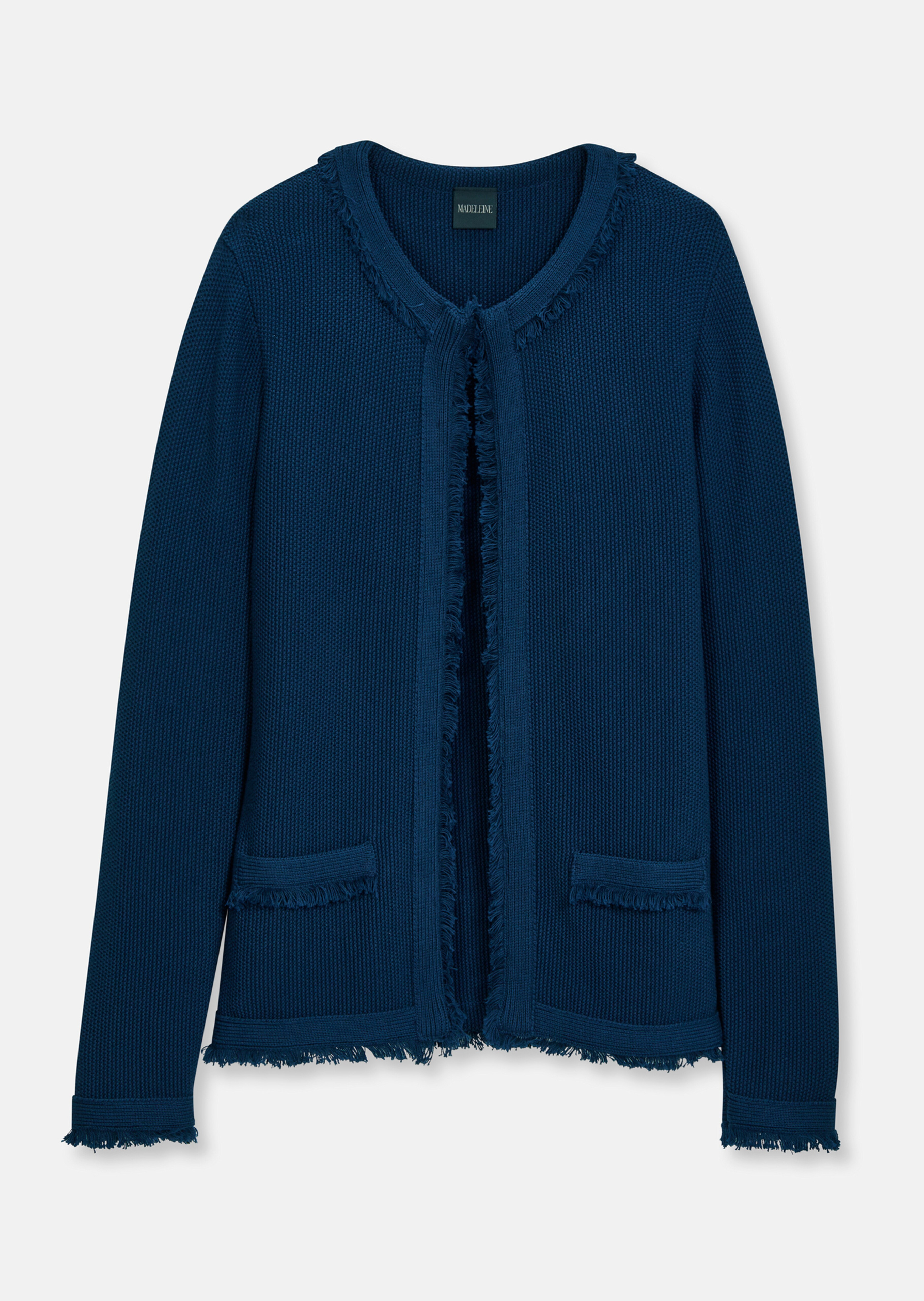 Strick setzt auf freche Akzente! Die Strickjacke mit Fransen an den Abschlüssen wirkt durch den hochwertigen, italienischen Strick in Reiskornoptik so modern und wertvoll. Die reine Baumwolle trägt sich angenehm kühl. Wir haben die edle Strickjacke im schlanken Style mit langen Ärmeln, Rundhalsausschnitt und Hakenverschluss gestaltet. Dank der klassischen Farbgebung können Sie sie vielseitig kombinieren - sehr schön auch zu maritimen Stylings.