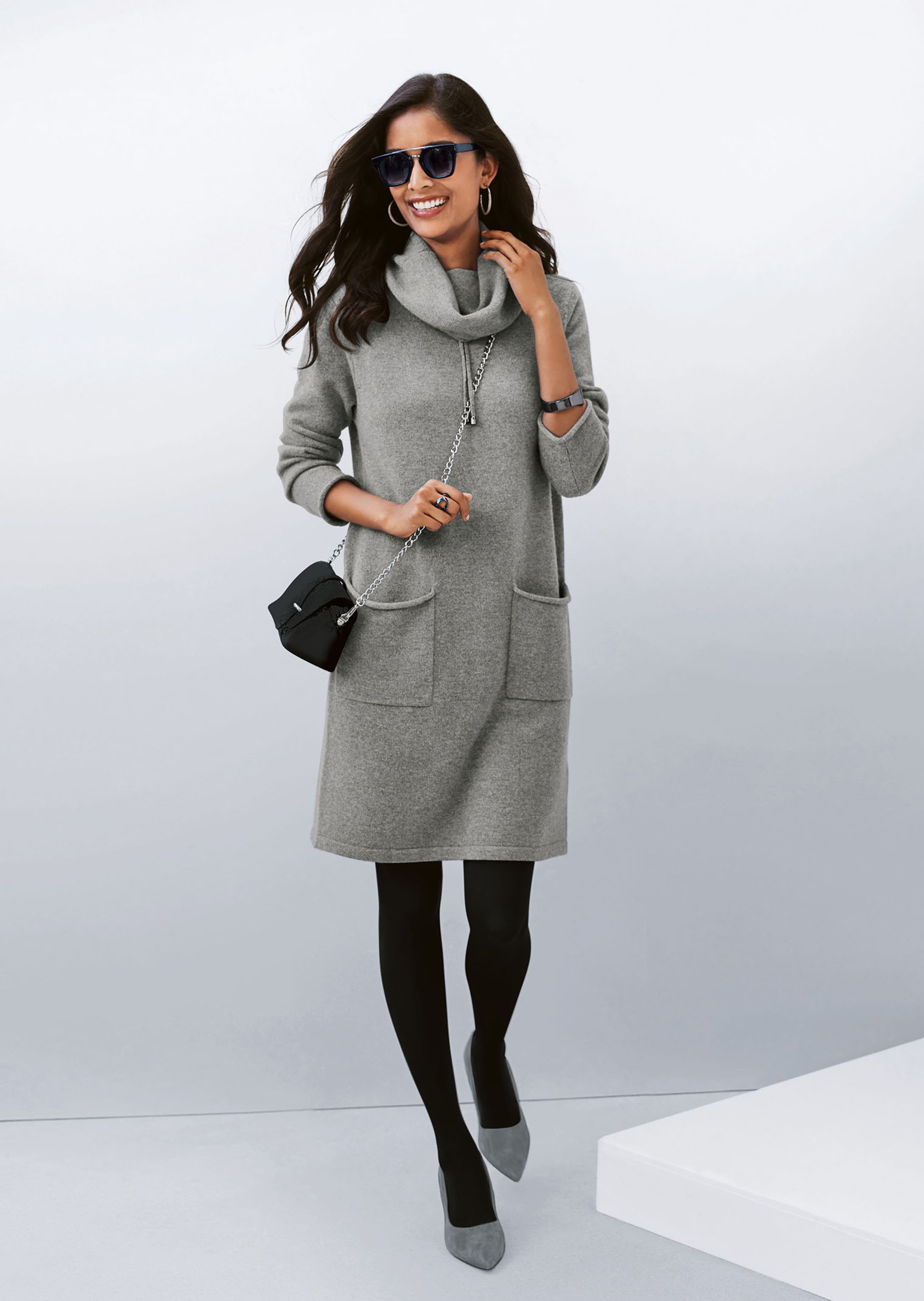 Strickkleider gehören zu den Mode-Favoriten des Winters. Sie sind besondes bequem, unkompliziert und lassen sich immer wieder neu variieren. Ganz so wie dieses legere Modell, das die Figur wunderbar umschmeichelt. Die hochwertige Wollmischung verwöhnt mit dem kuscheligen Komfort luxuriösen Kaschmirs und trägt sich herrlich angenehm. Aufwendig in Form gestrickt zeigt es sich mit langen Ärmeln, aufgesetzten Taschen im Vorderteil und Rollkante am Ärmelabschluss. Der hohe Rollkragen fällt schön locker und lässt sich durch einen variablen Kordel-Tunnelzug individuell regulieren. Perfekte Styling-Partner: blickdichte Strümpfe. Auch mit Slimline-Hosen ist das Kleid ideal kombinierbar.