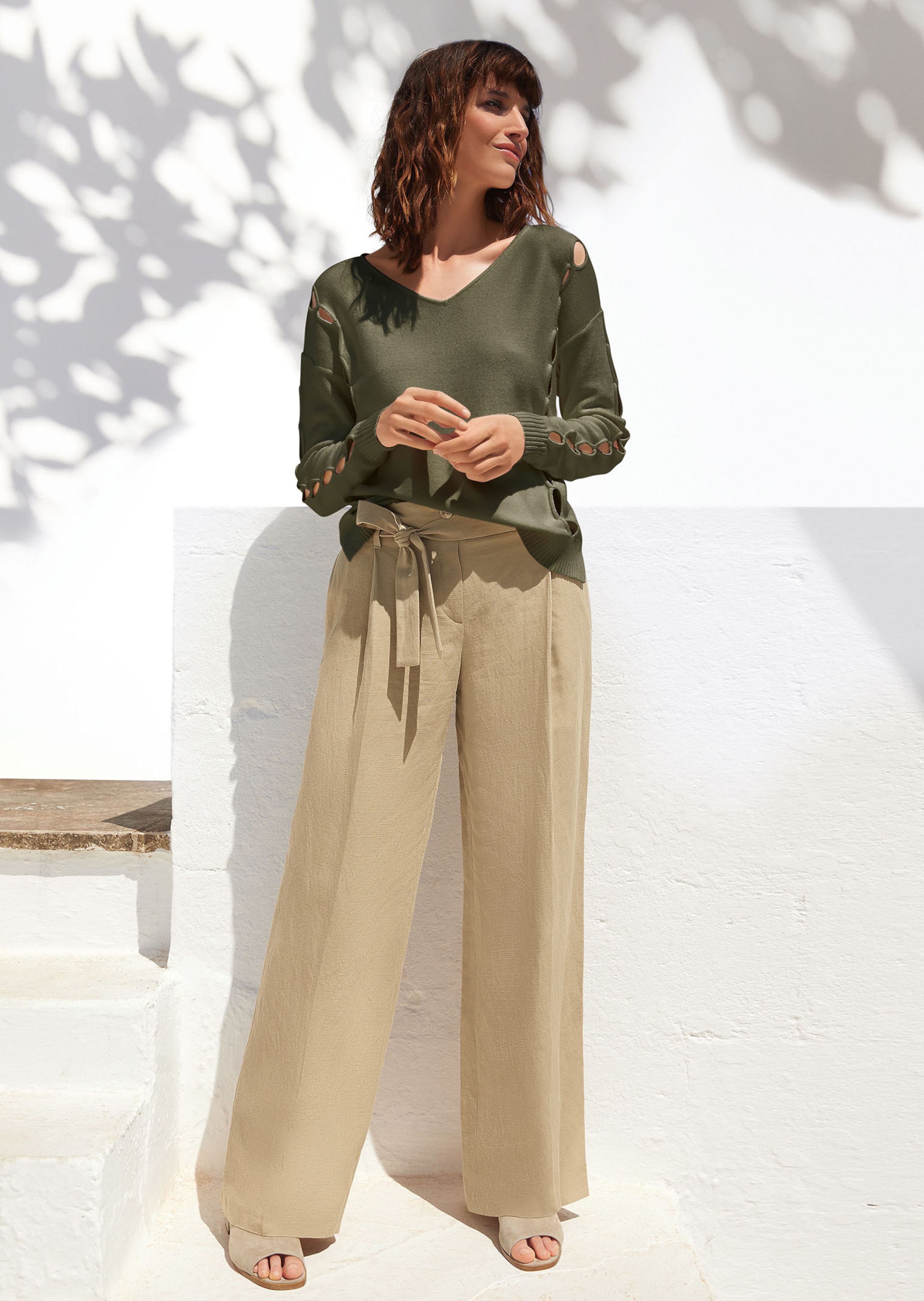 Cut-outs zählen nach wie vor als Must-have und verleihen den aktuellen Maschen-Styles ihren ganz besonderen Reiz. Dieser Pullover lässt an den Seitenpartien und Ärmeln auf raffinierte Weise die Haut durchblitzen. Der Glattstrick ist wertvoll im Griff und wohltuend auf der Haut. Die legere Form kann vielseitig kombiniert werden – ganz gleich, ob lässig, betont modern oder zu eleganten Anlässen. Mit diesem Pullover liegen Sie immer richtig! Die kofferfreundliche Garnmischung ist ideal für die Reisegarderobe und mit breitem V-Ausschnitt, langen Ärmeln, lässigen Seitenschlitzen und formstabilen Rippenabschlüssen ausgestattet.